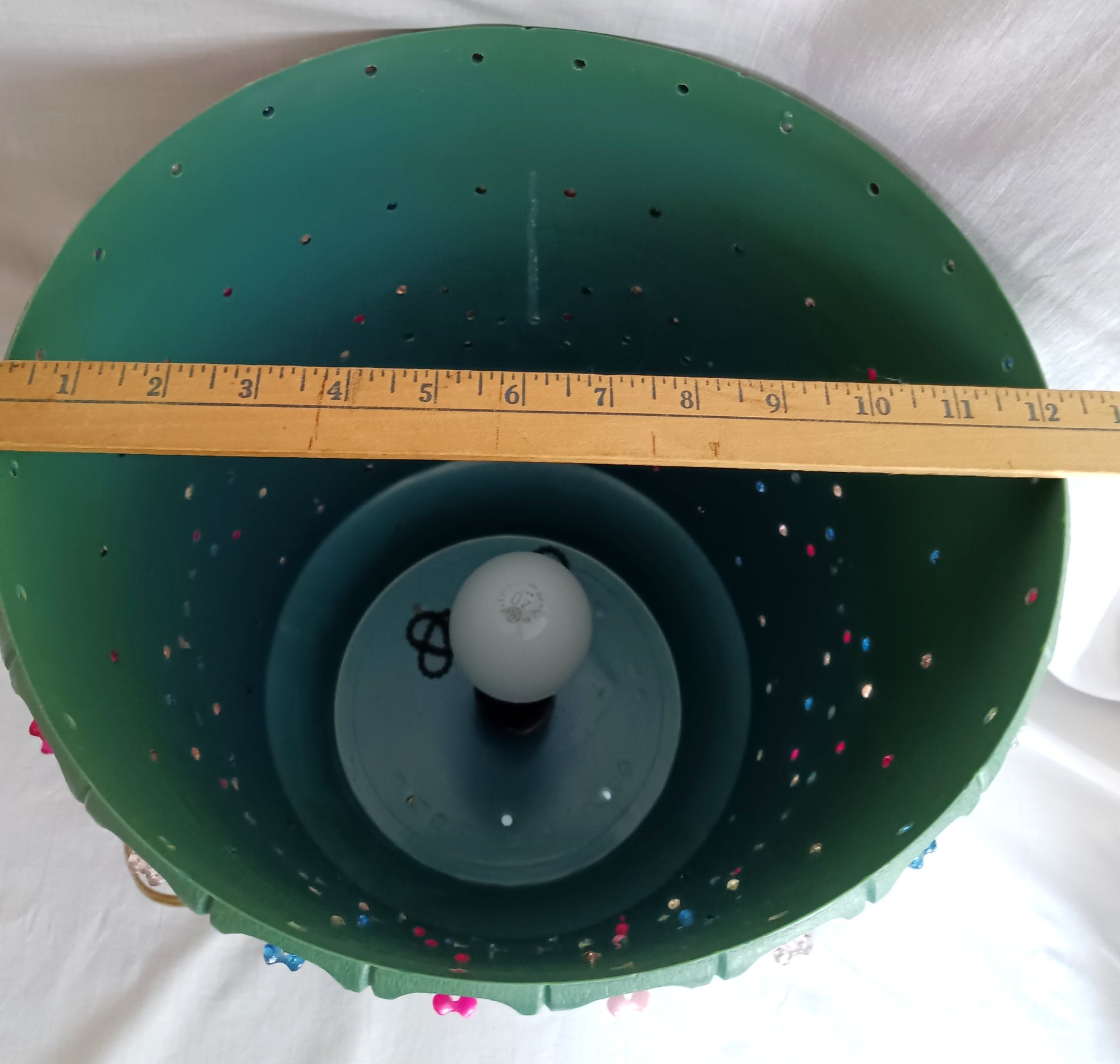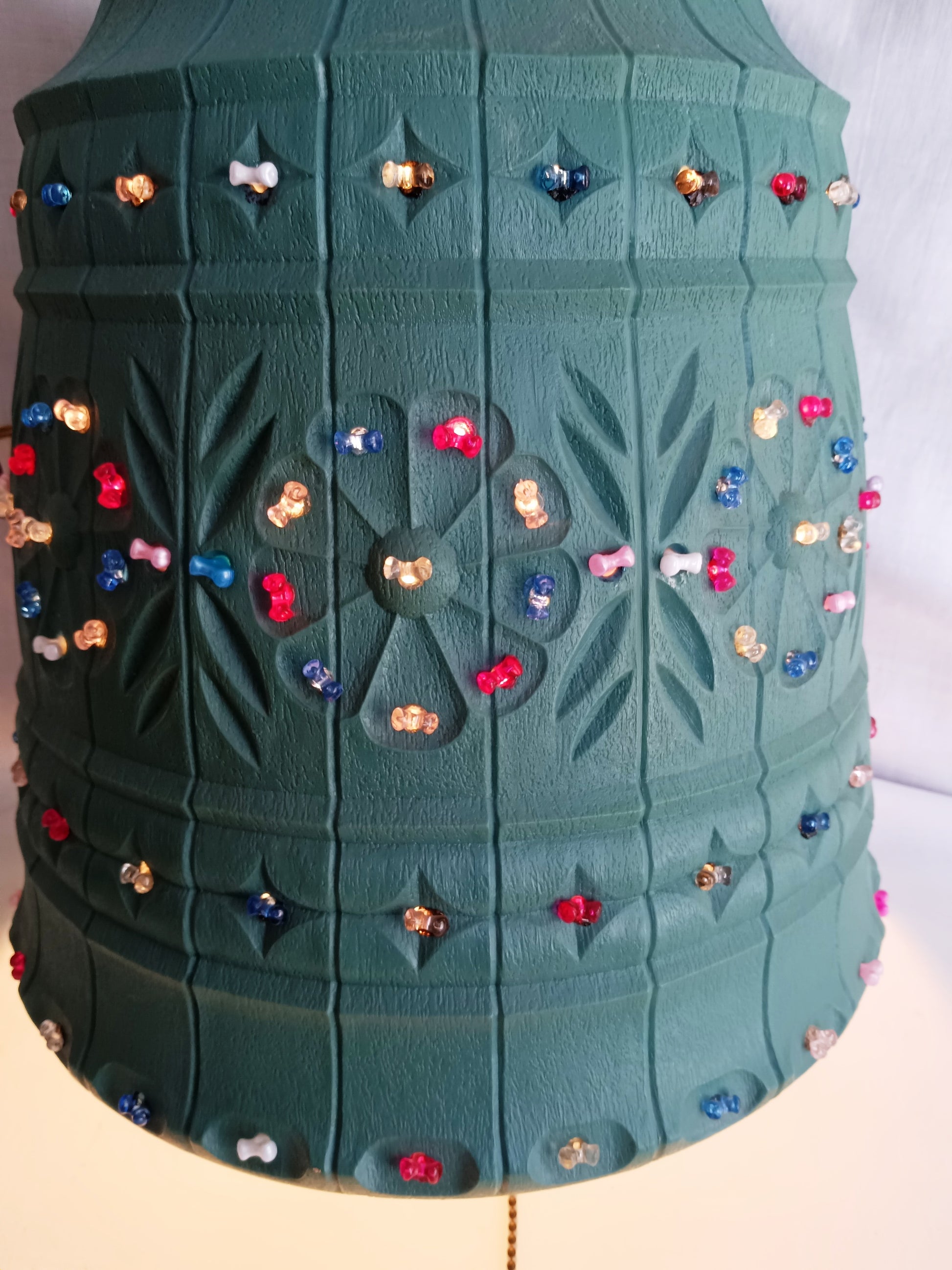 For sale is a vintage 1970’s Lawnware beaded hanging swag lamp/pendant crafted from green color hard plastic large planter or garden pot. It features a carved floral pattern accented with translucent pastel colors plastic gems or beads that glow when lit. Pendant comes with a long electrical cord with plug and hangs from a sturdy brass plated metal chain. Lamp takes a standard bulb max. 40 watt (not included) and operates on/off with a brass beaded chain switch. Good working conditions.