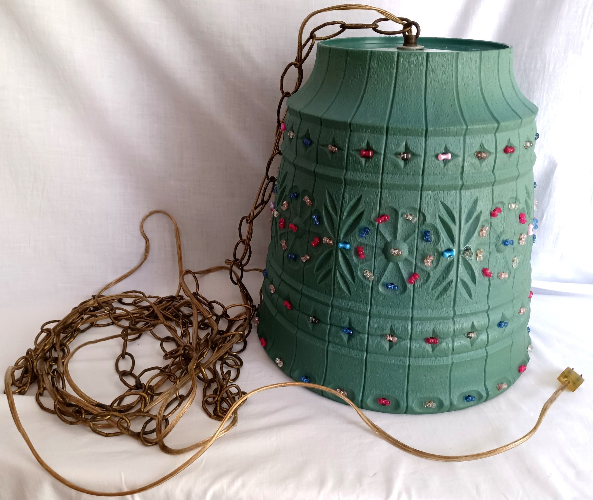 Vintage Large Pendant Lawnware Beaded Hanging Swag Lamp Green Molded Plastic Bell Shape Carved Floral Long Chain Plug In Retro Lighting