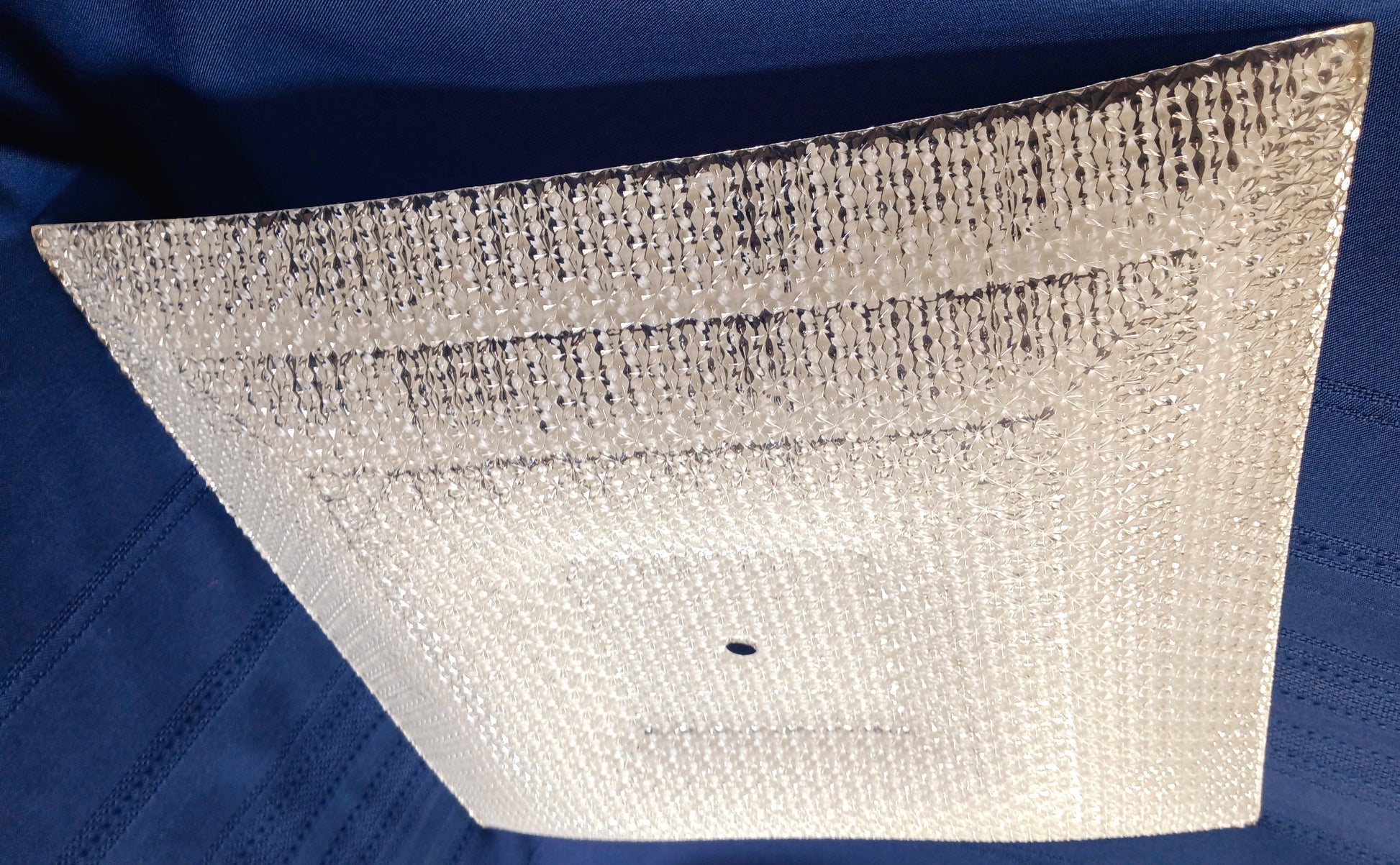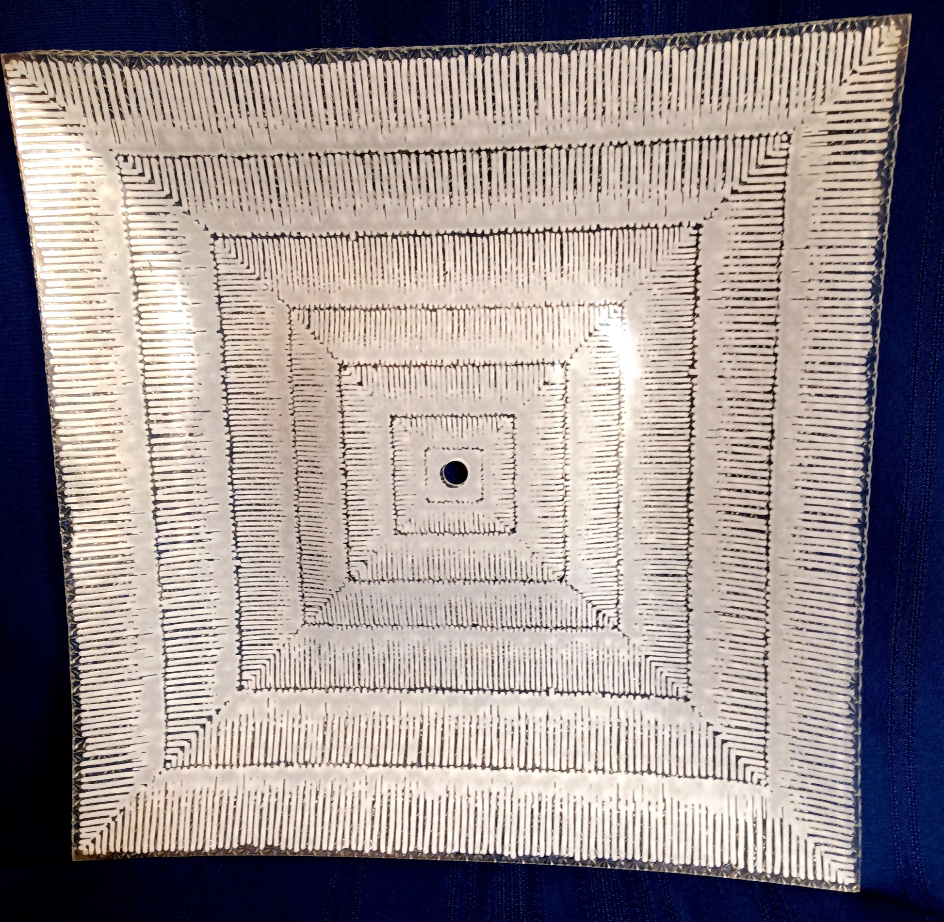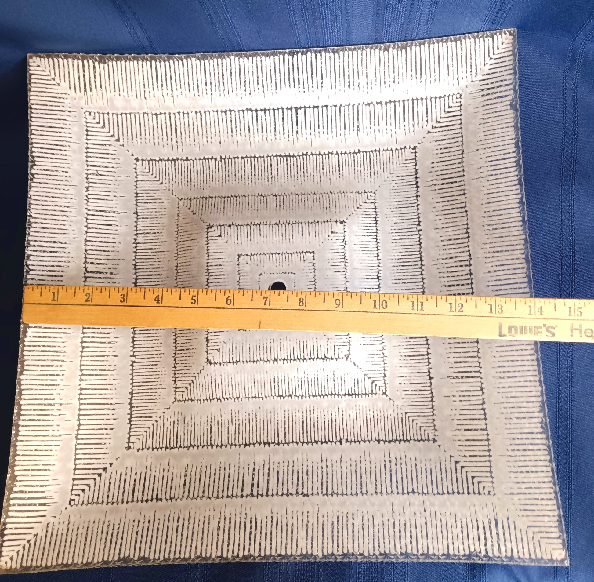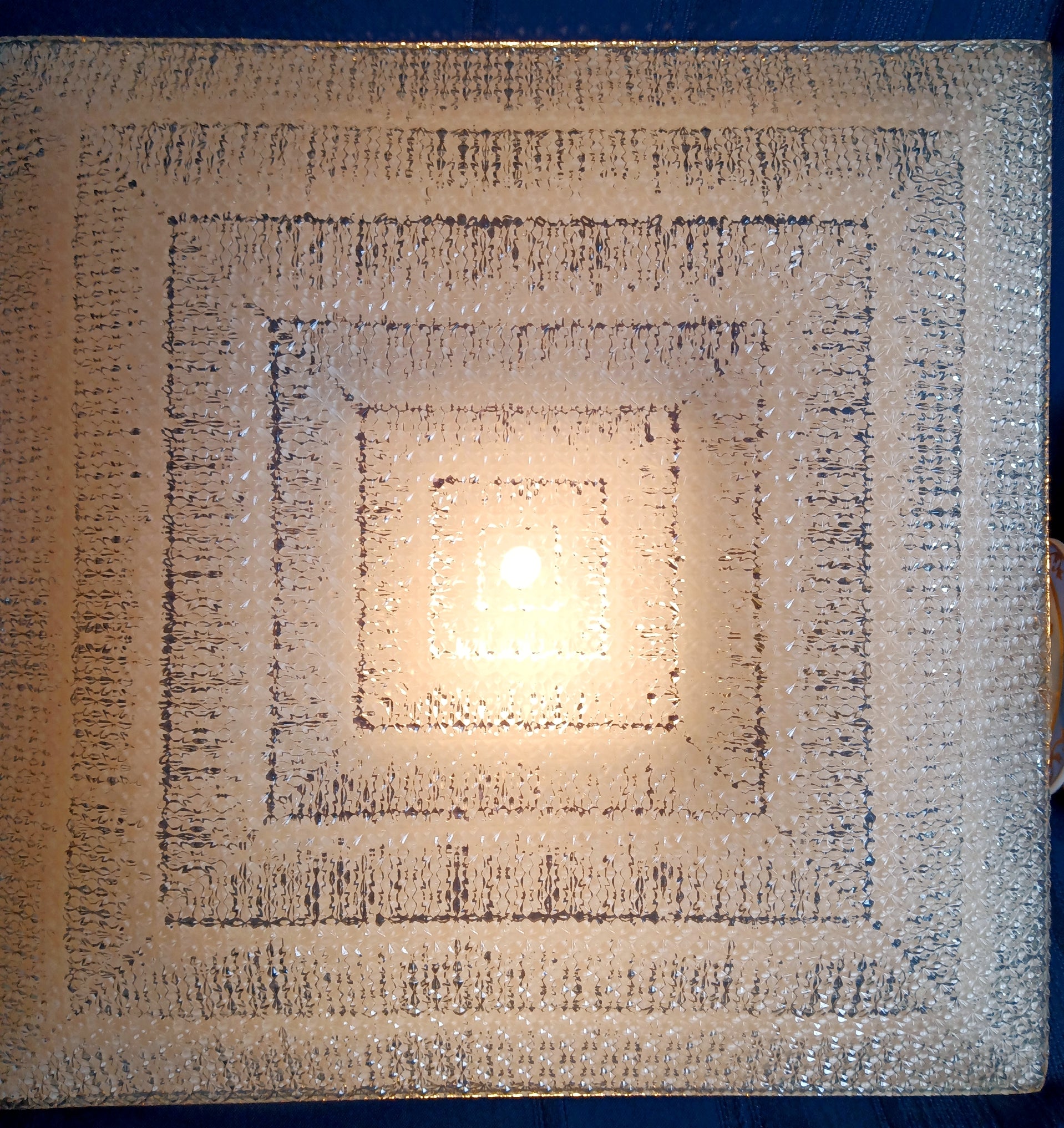 This listing is for a Mid Century Modern square glass replacement lampshade with straight edges for semi flush ceiling light fixture. Exterior of the shade is clear glass with textured/raised floral design. Interior features glossy white geometrical patterns. This is a very heavy glass shade. Stunning piece.
