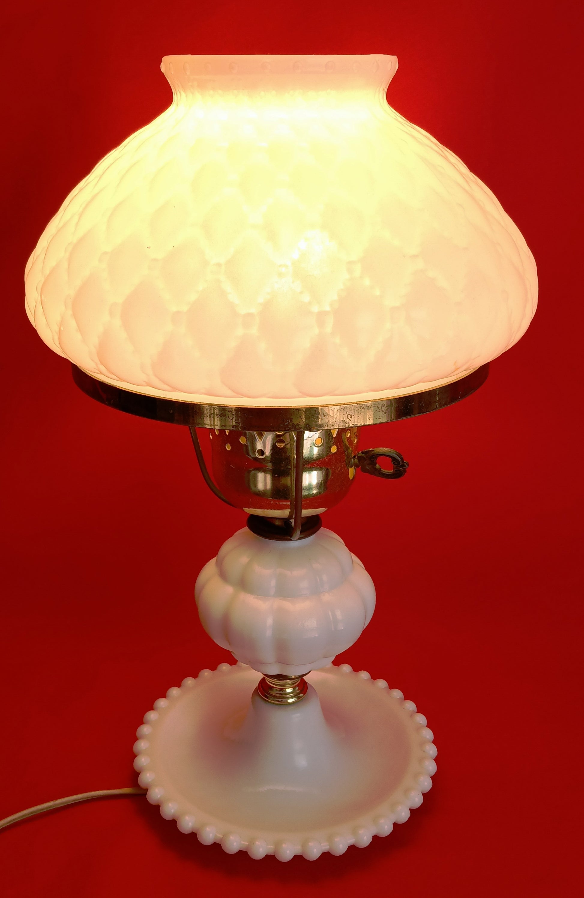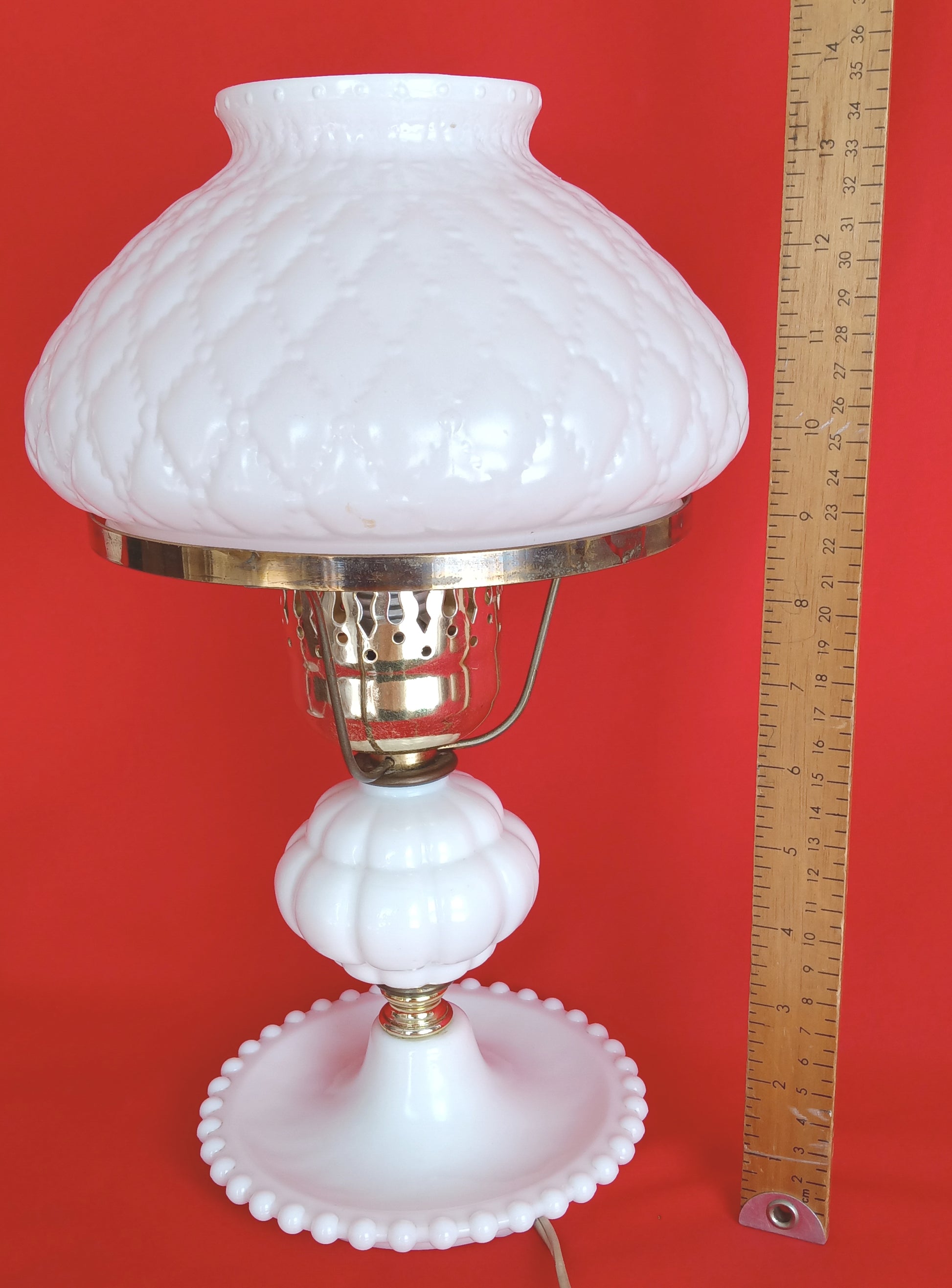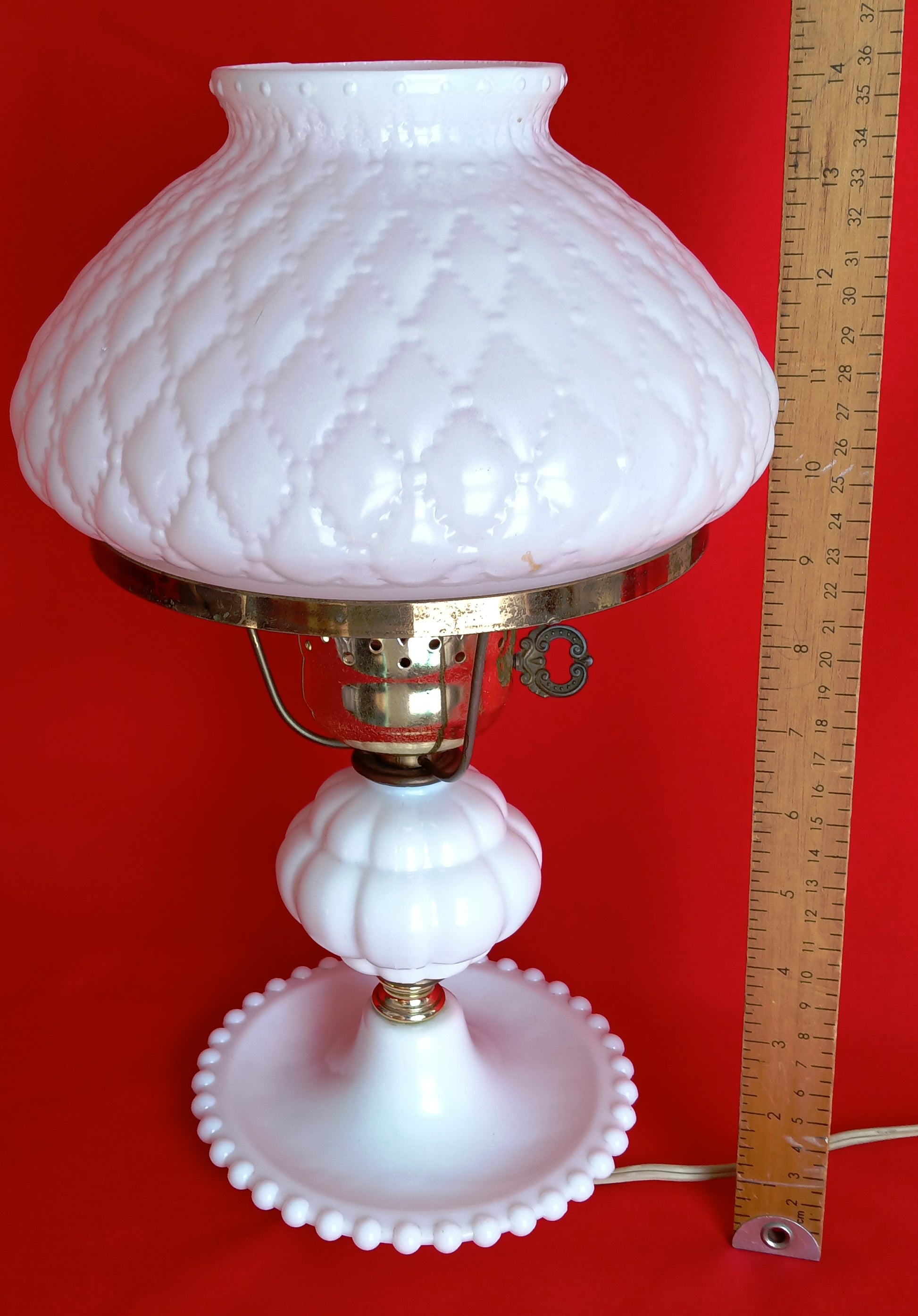 Vintage Milk Glass Lamp Beaded Tray Base Quilted Diamond Pattern Shade Parlor Table Statement Lamp GWTW Style Retro Lighting