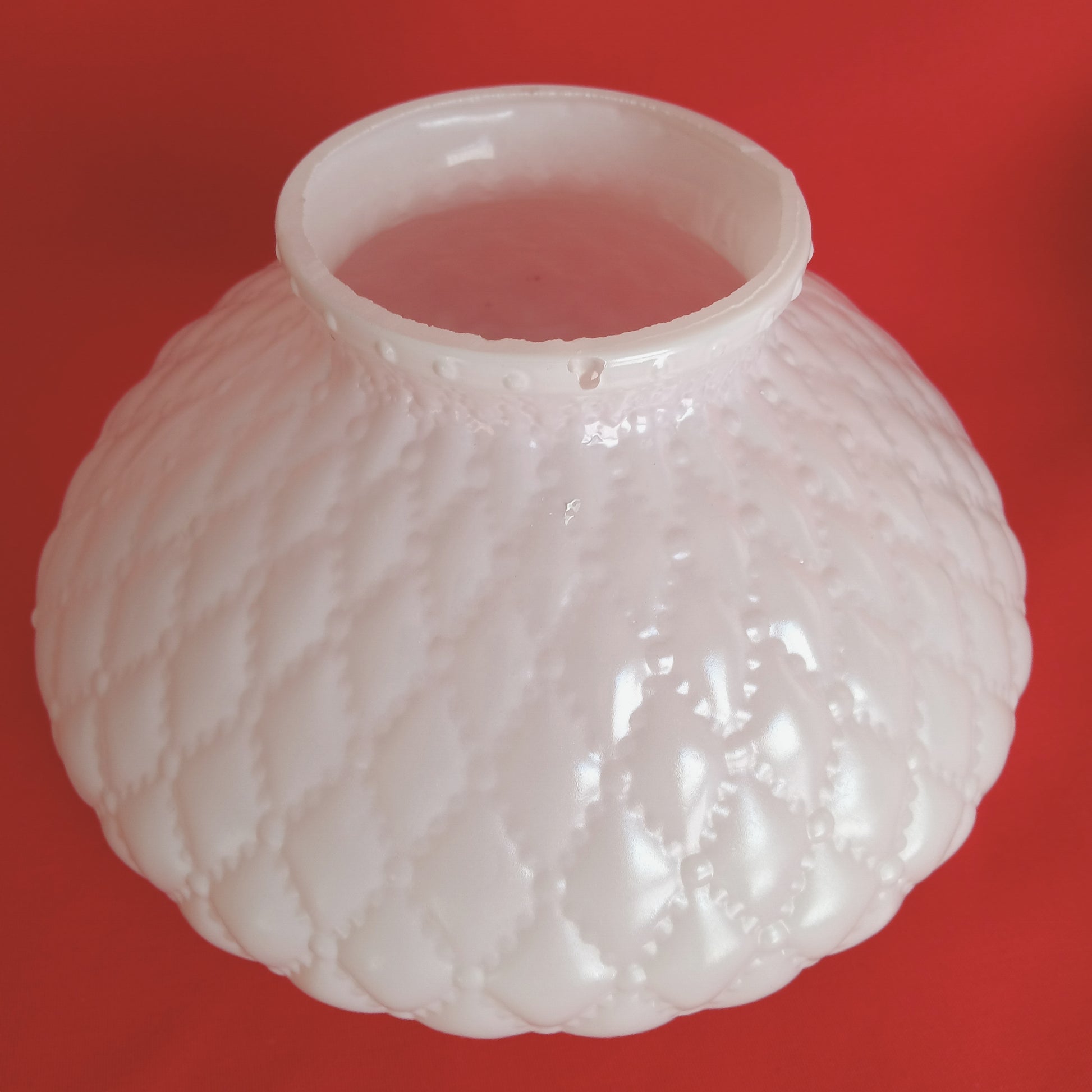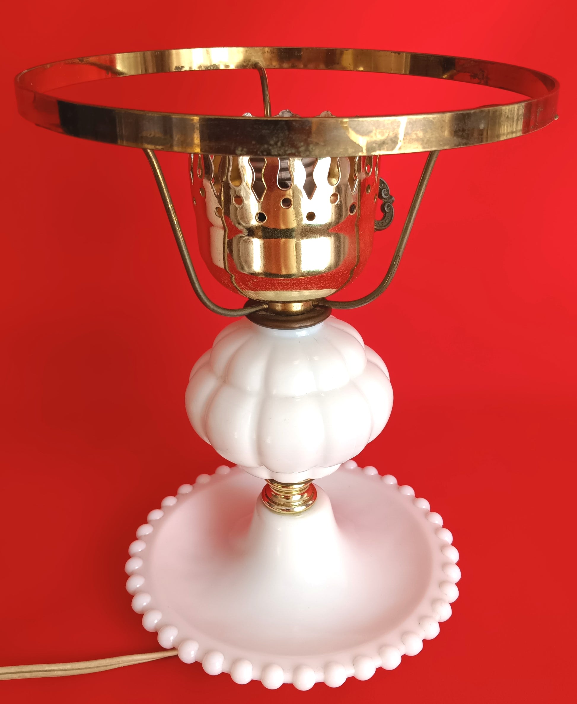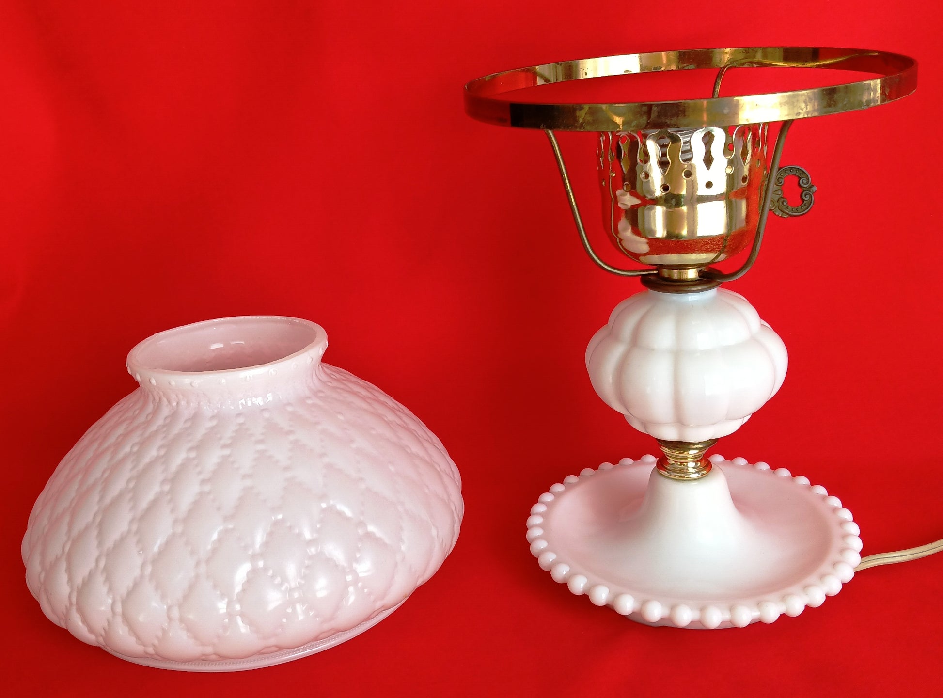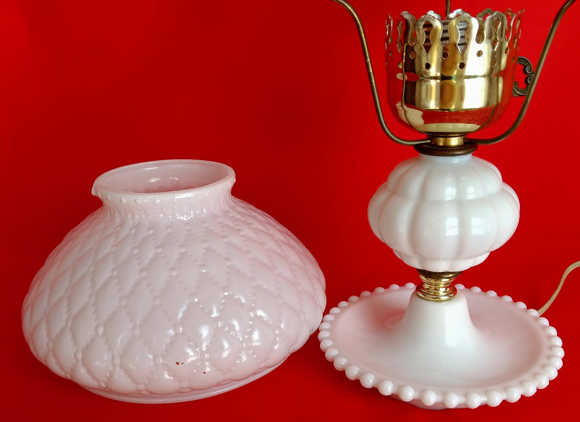 Vintage Milk Glass Lamp Beaded Tray Base Quilted Diamond Pattern Shade Parlor Table Statement Lamp GWTW Style Retro Lighting