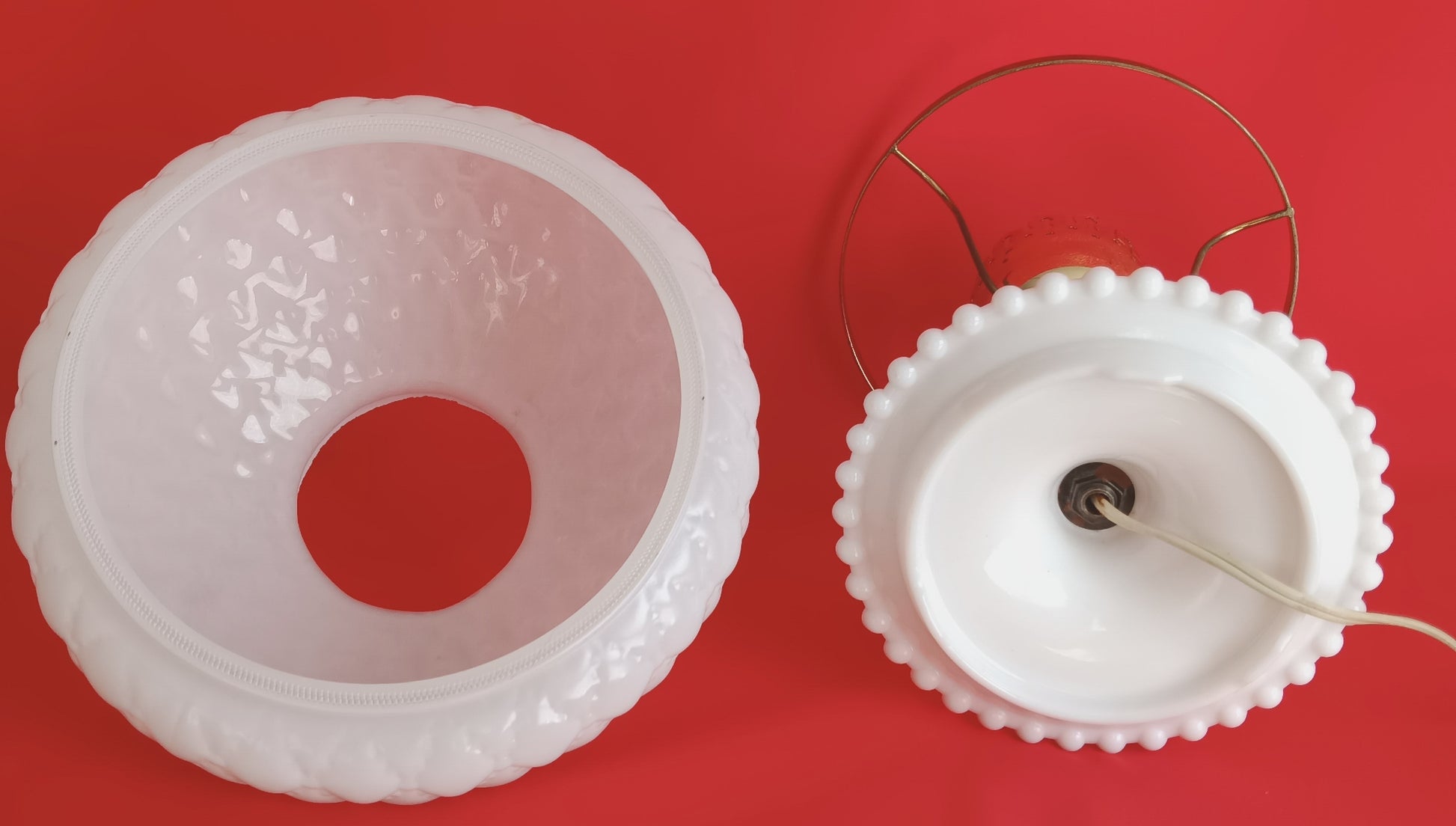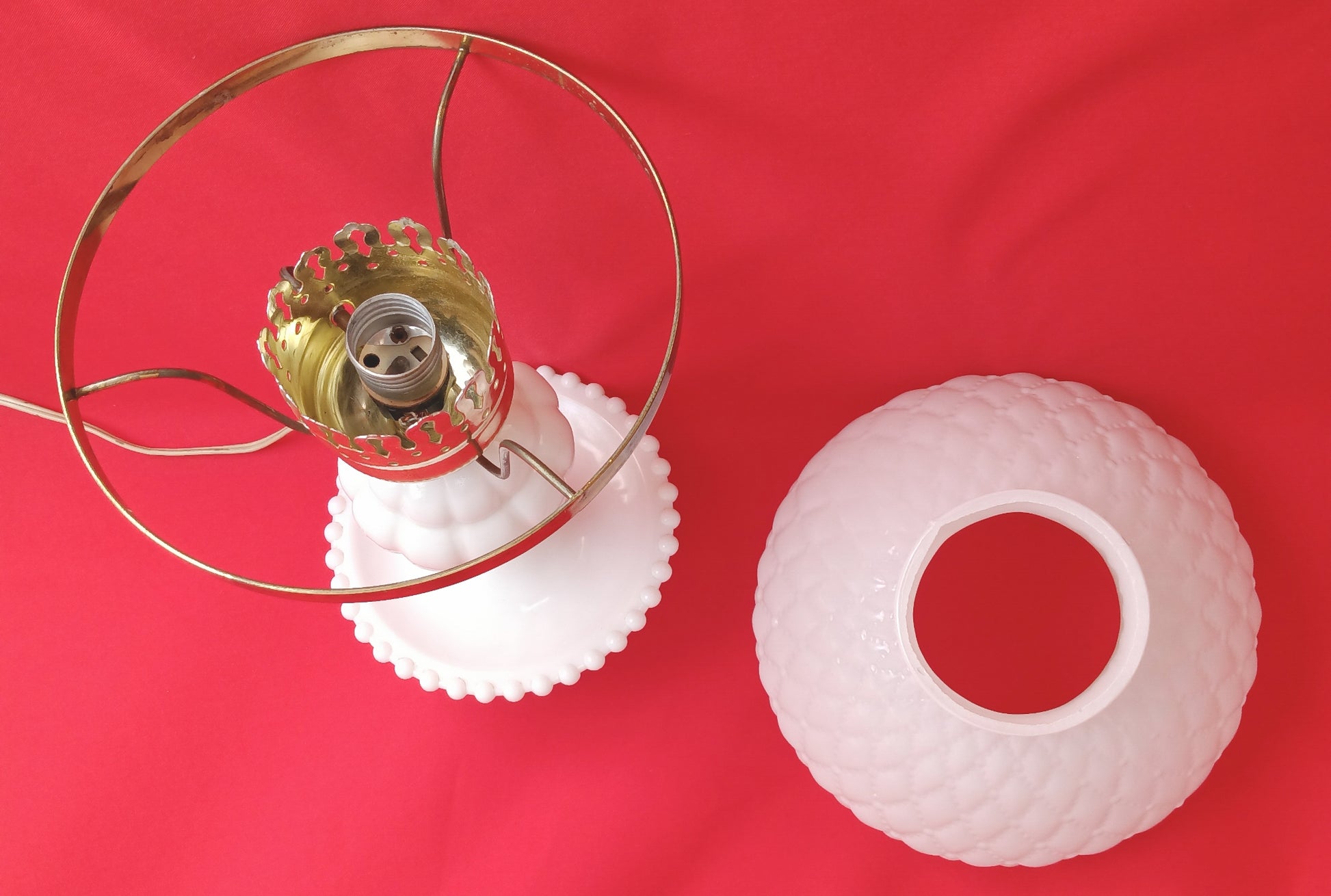 Lamp is in excellent vintage condition. There are no cracks, chips, dents, or repairs. Slight patina on metal parts. White lampshade has few small clear spots, from manufacturing process. Please see last 2 pictures.