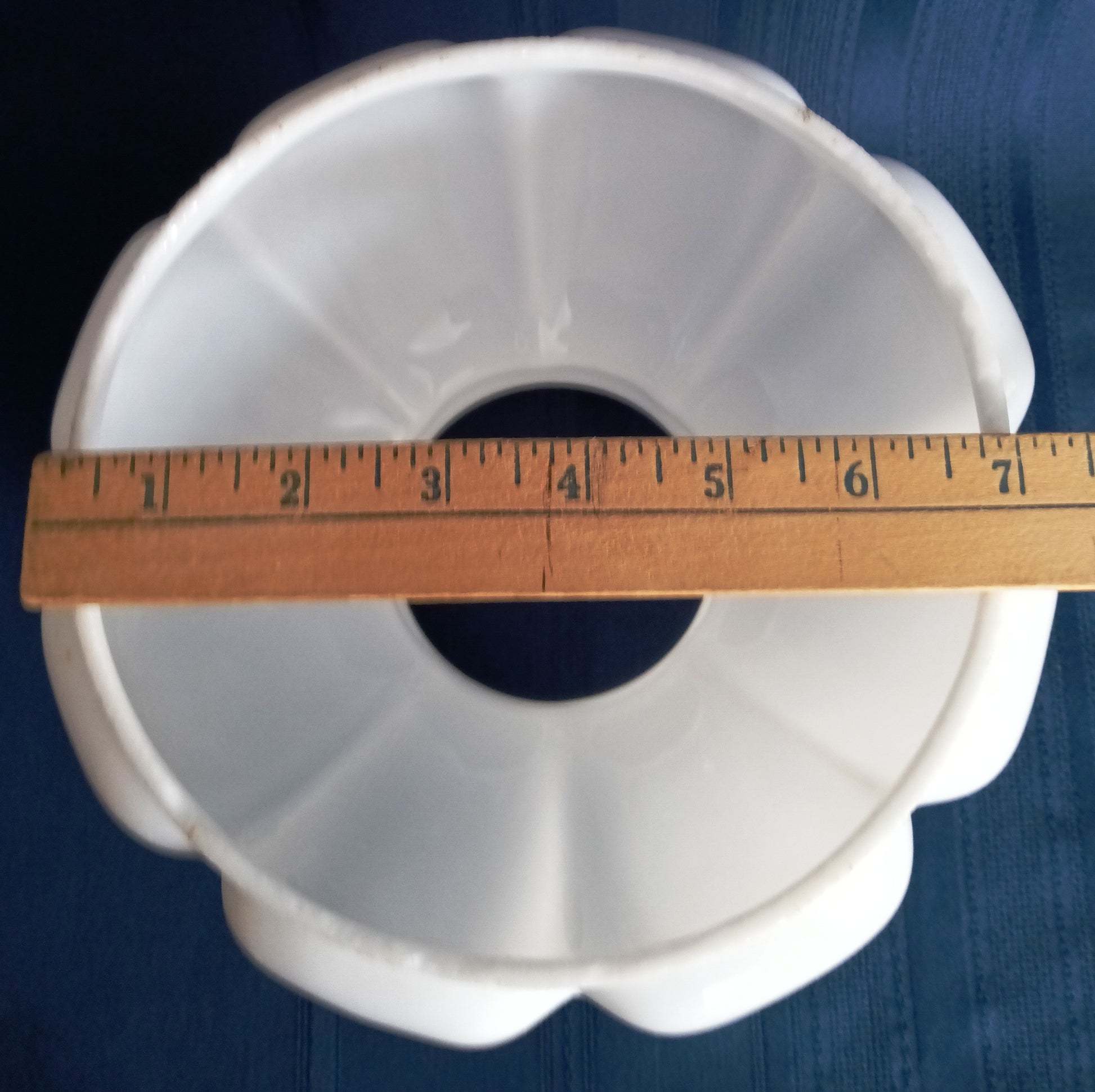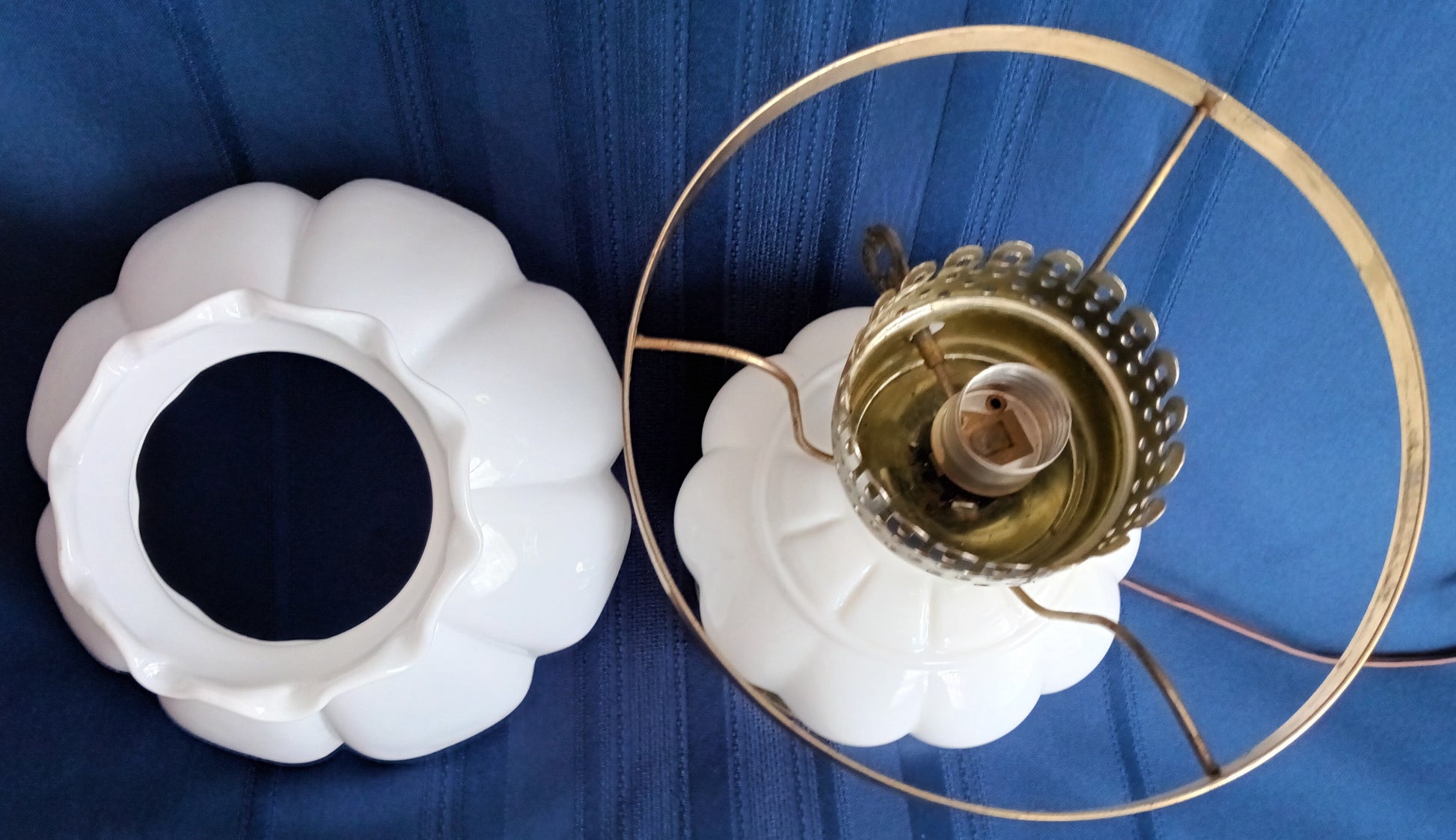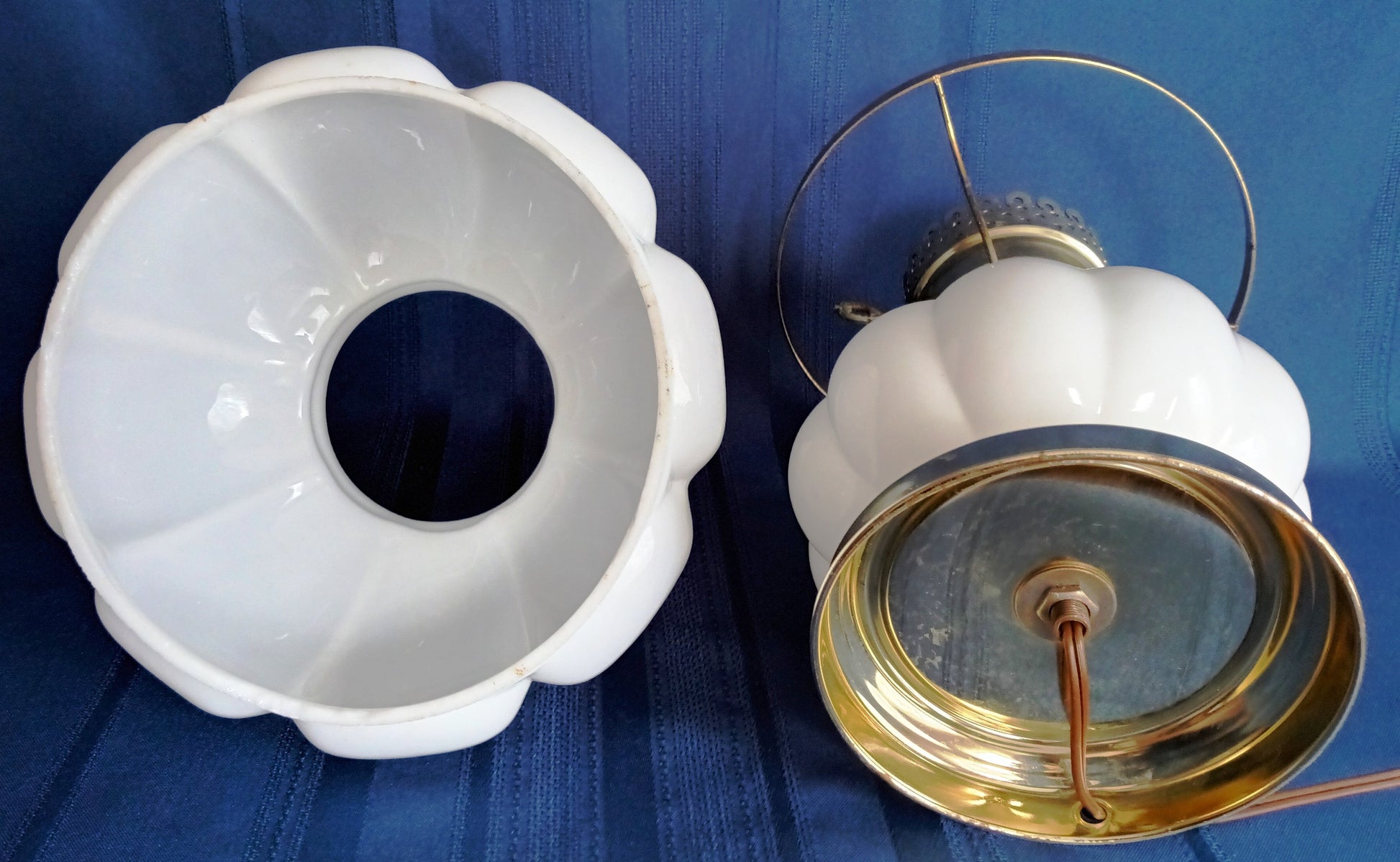*Milk glass body globe and a heavy shade, both with melon style design. There is a scalloped edge on top of the shade and a glass ring under crown.