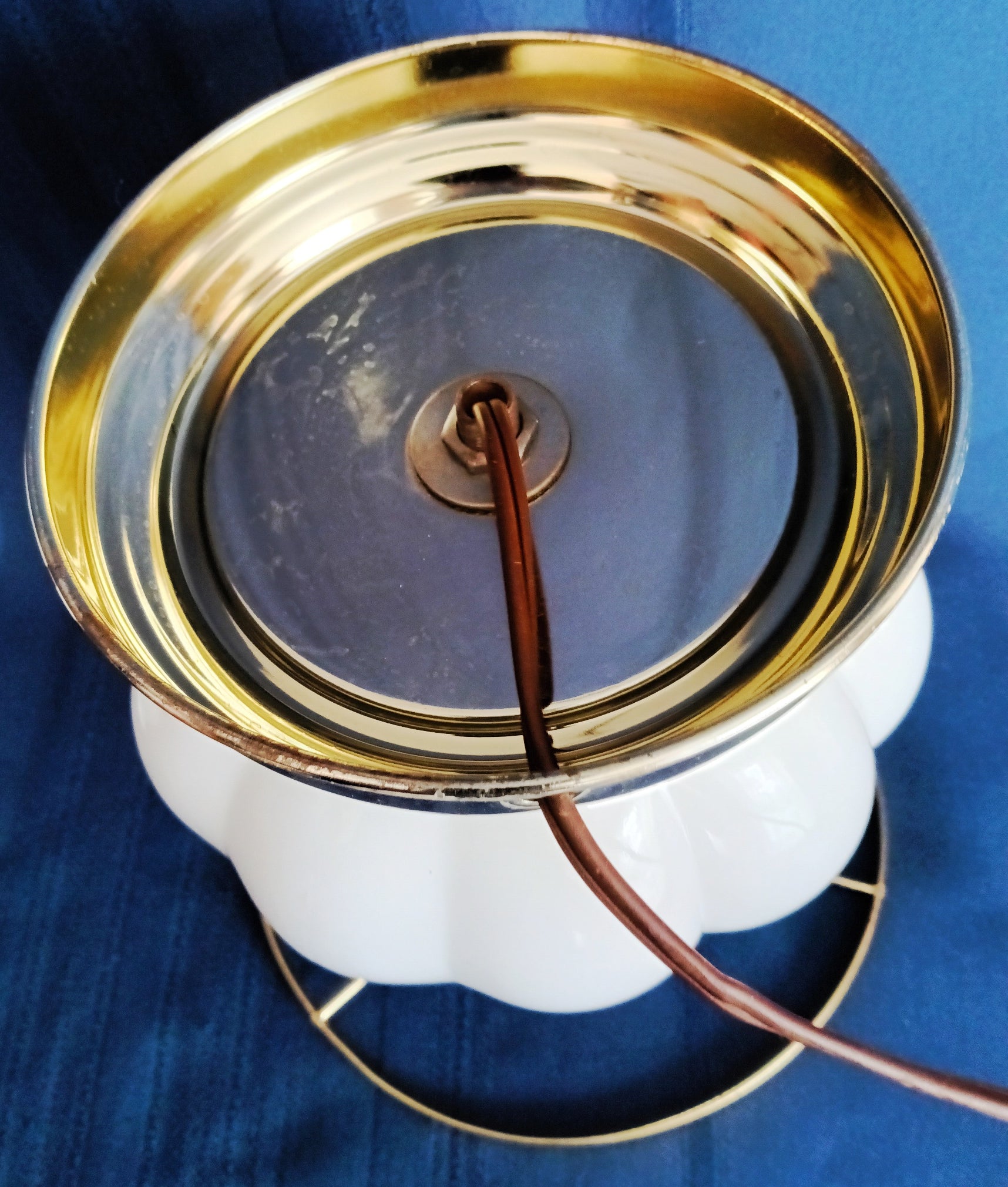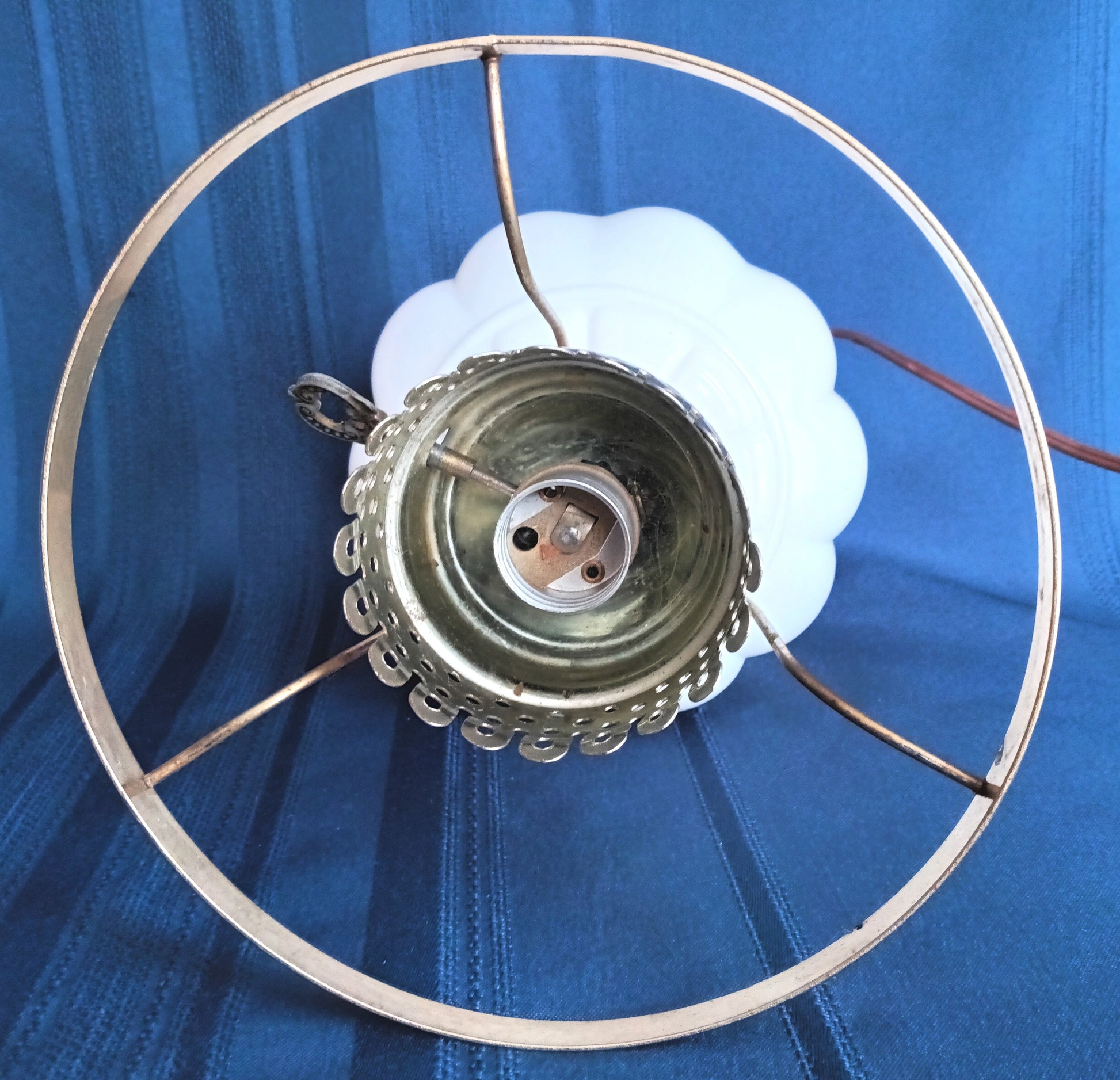 Lamp is in excellent vintage condition. There are no chips or breaks on lamp’s body or shade. Some minor chipping and roughness to the edge of the shade (fitter). No dents or dings on metal parts. Very light sign of wear and age.