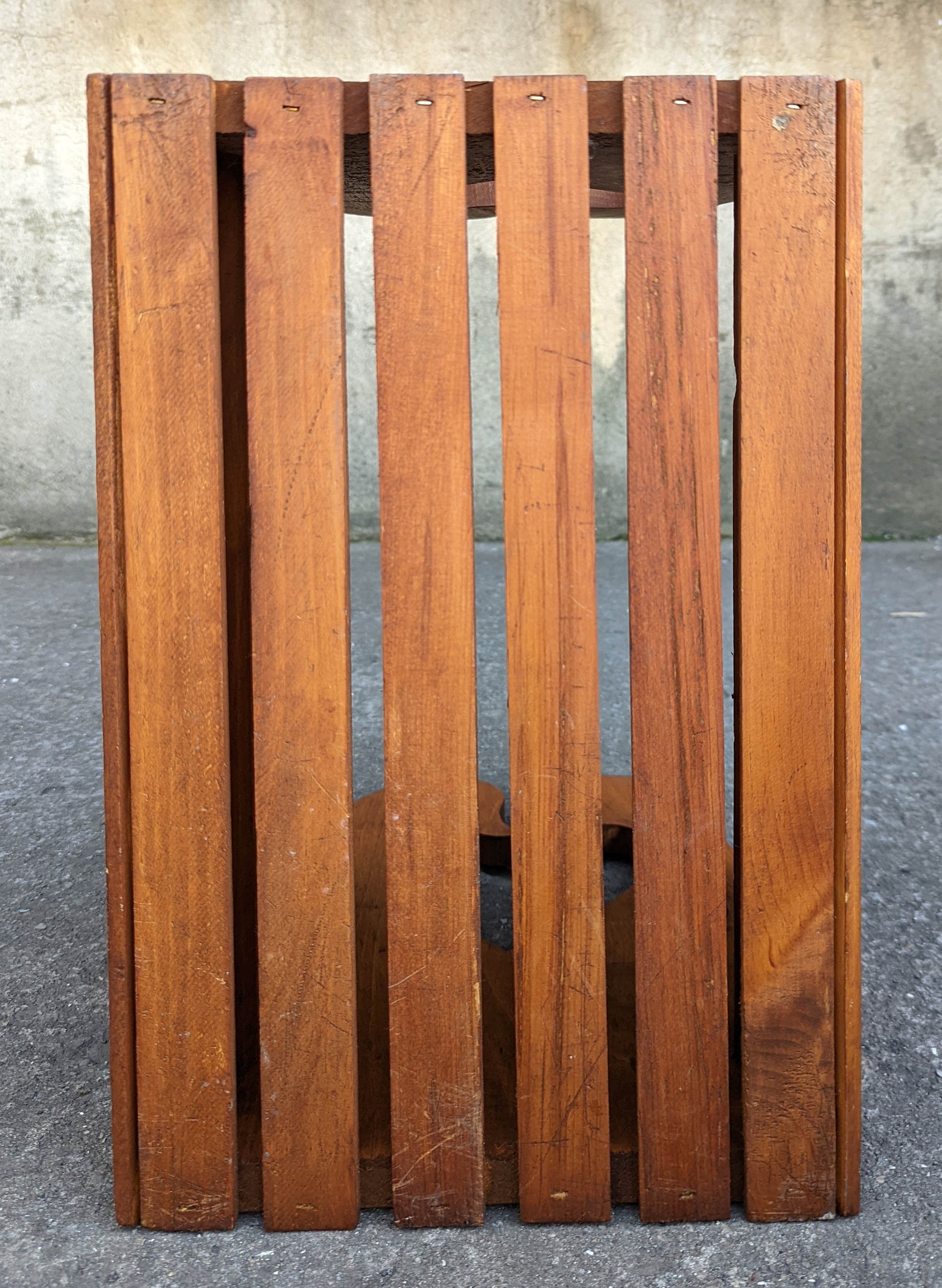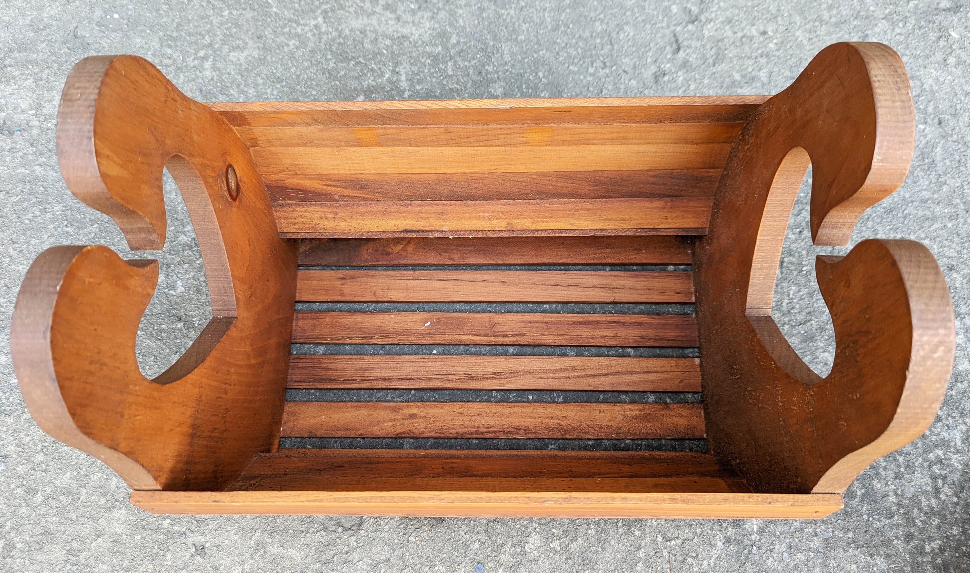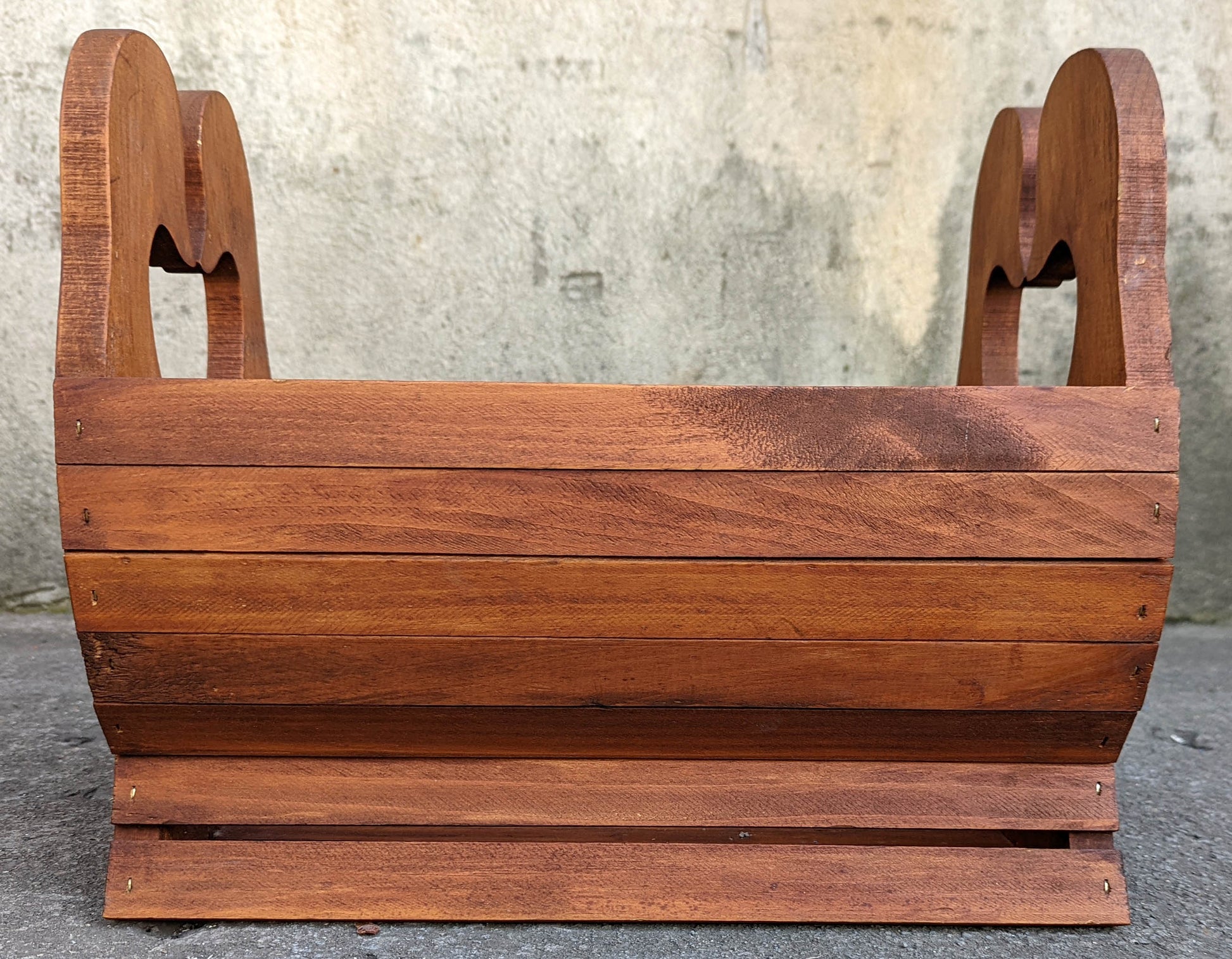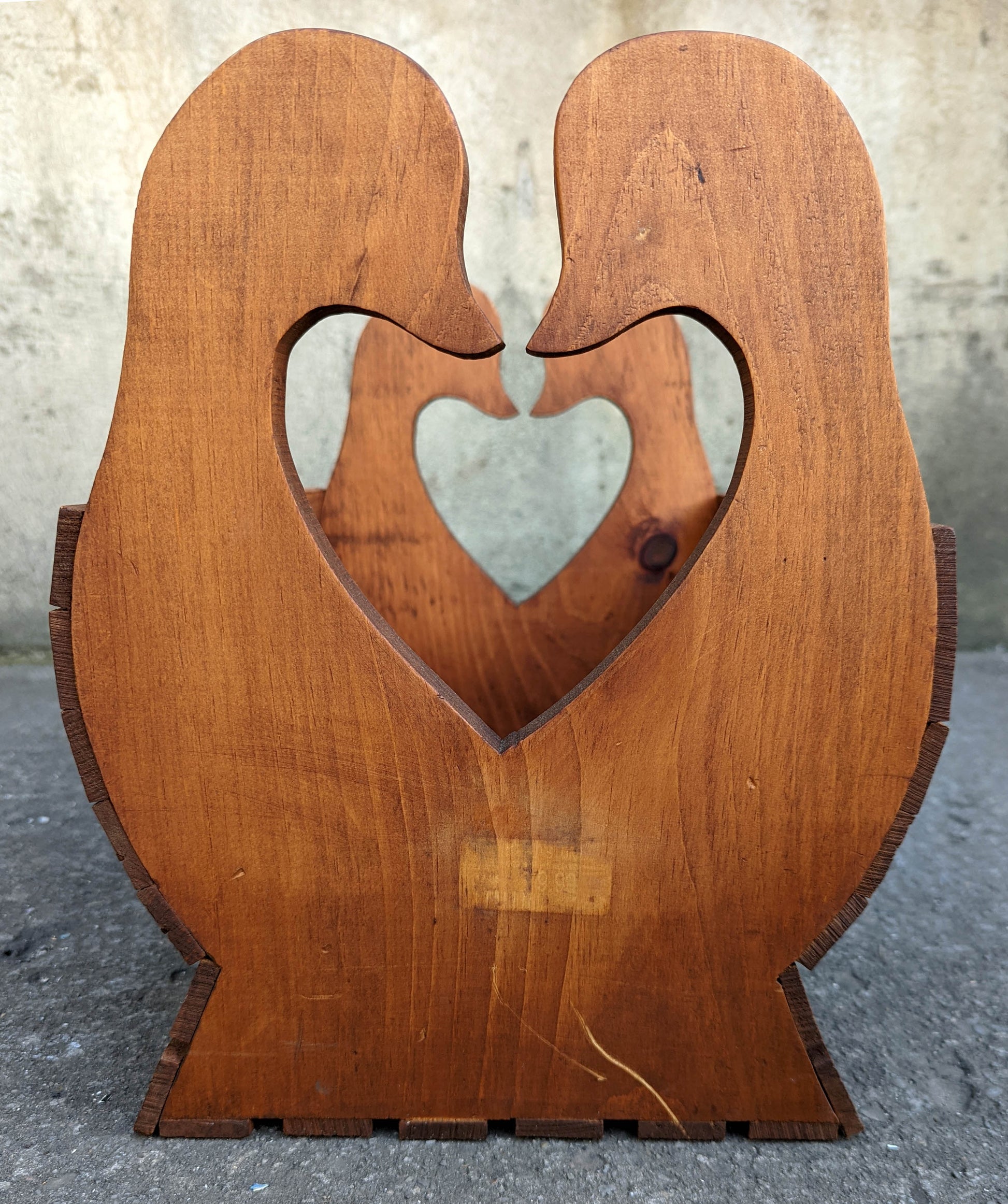Charming, vintage, wooden box salvaged from Northeastern PA. The basket consists of 2 carved sides with goose heads coming together at the top to form a heart, and is connected with a series of thin, wooden slats.