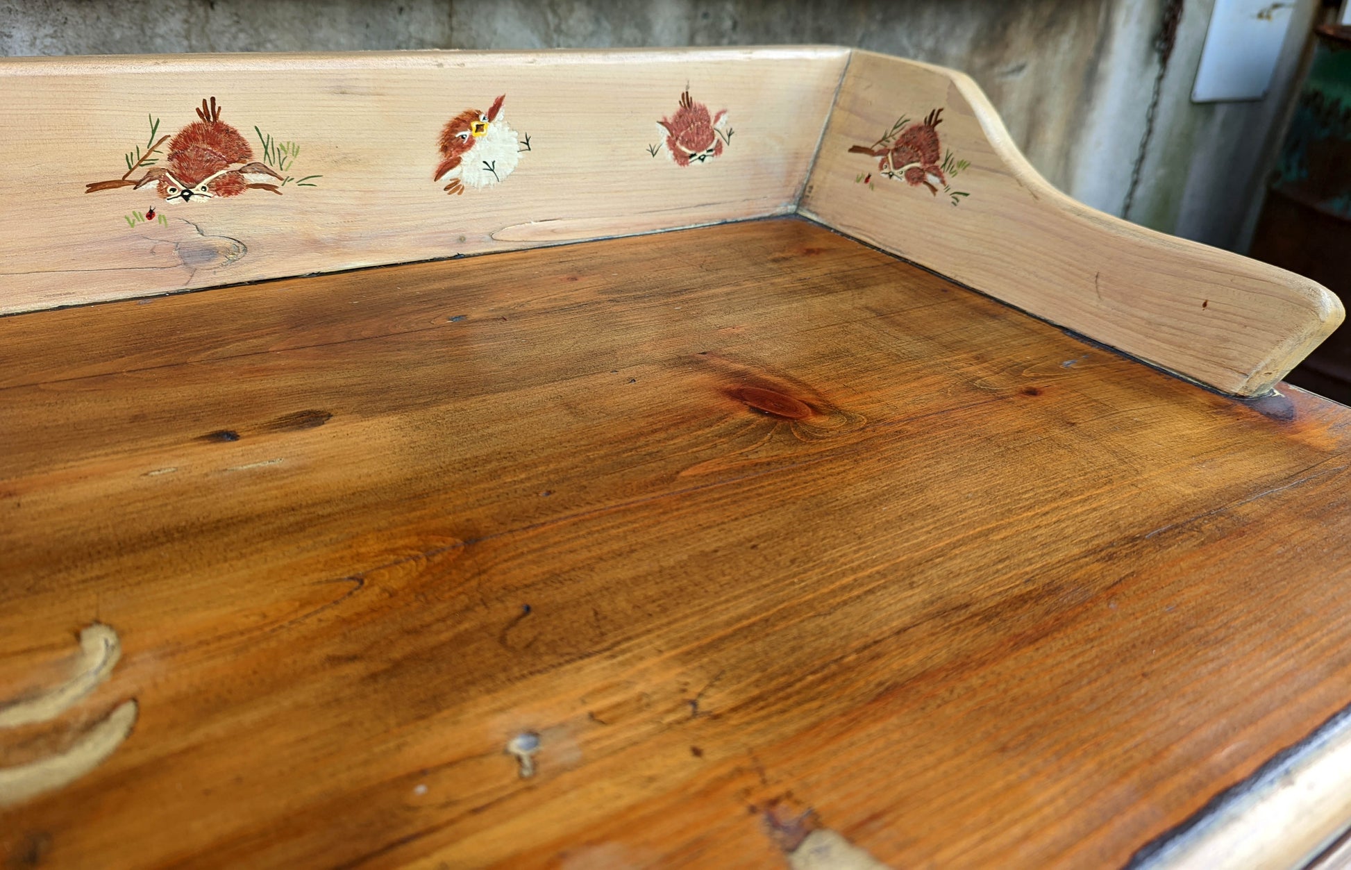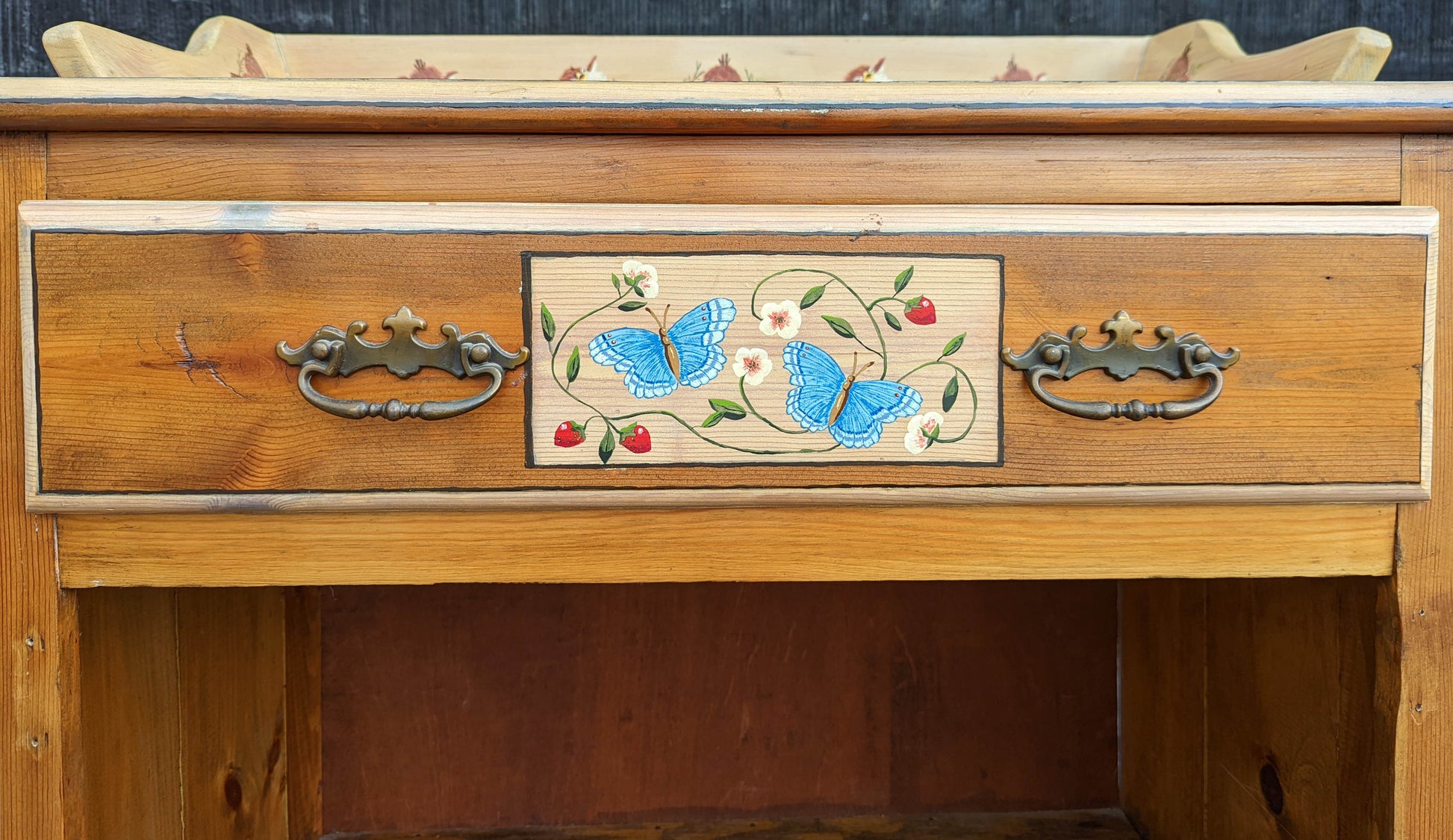 The drawer face and backsplash have cute hand-painted designs of butterflies, fruit, flowers, and chunky chicks.