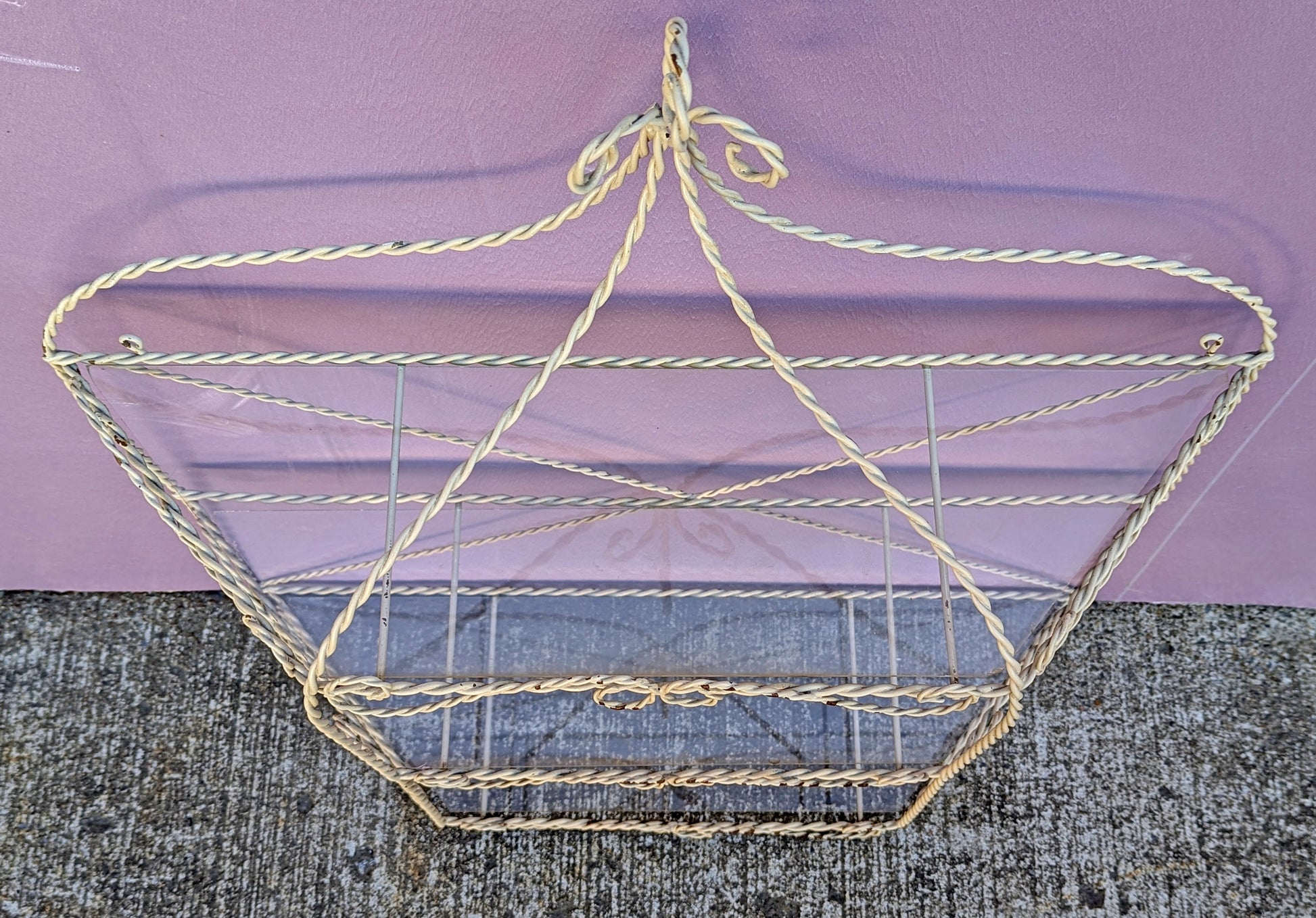 Lovely, metal wire, wall shelf salvaged from Northeastern PA. The shelf is made of a steel wire that's encased is coated with something that feels like plastic or paint.