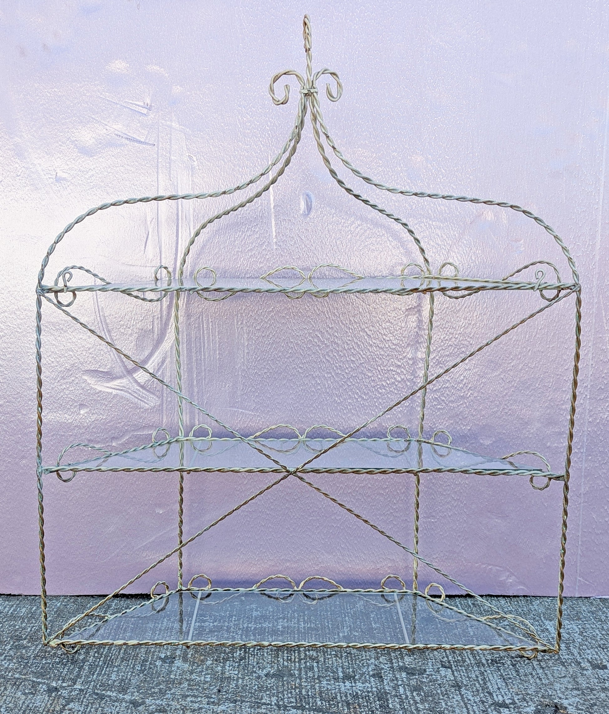 Vintage Old Reclaimed Salvaged Regency Distressed Trapezoid Metal Wire Glass Wall Mounted Kitchen Room Shelf Shelves Hanging