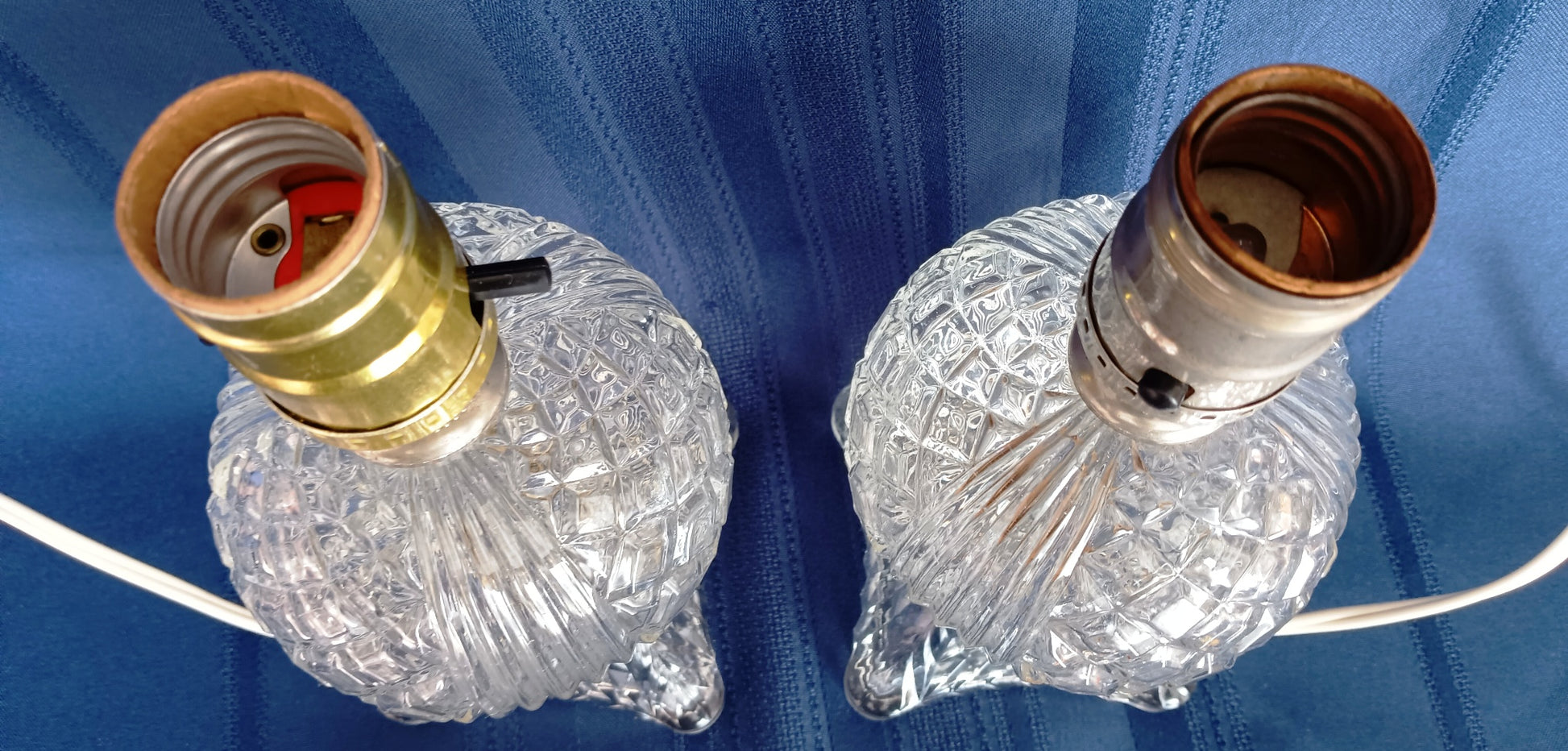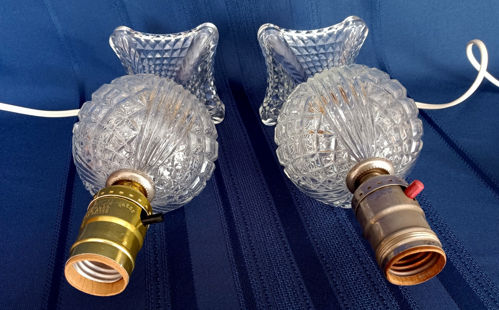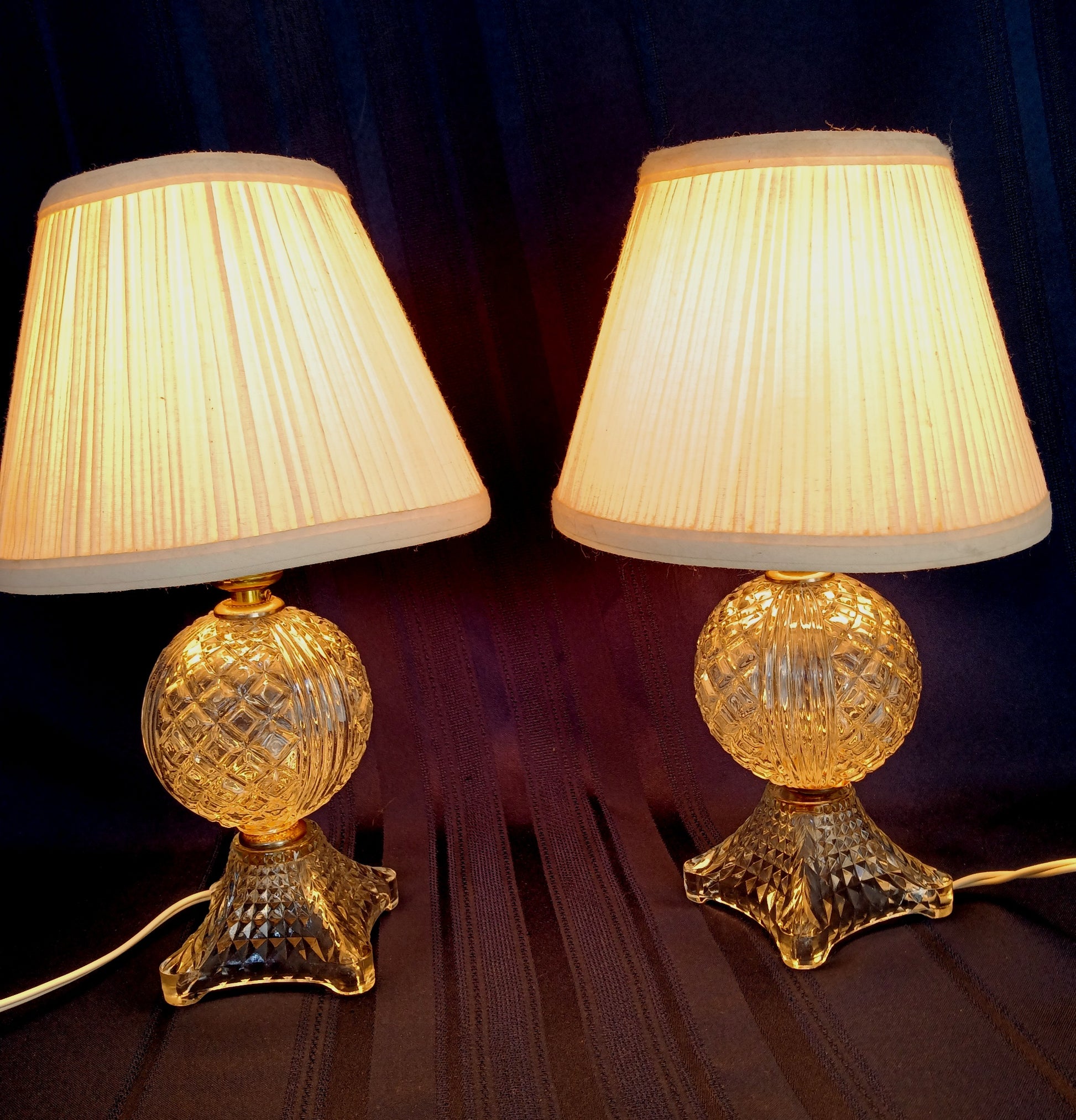 For sale is a set of 2 vintage clear pressed glass lamps with geometric design. Each lamp features a ball shape body with diamonds and vertical lines patterns and a square base with small diamonds design. The lamps operate with push-through on/off switches. Sockets are made by Leviton-USA. One socket is original to the lamp and the other looks like it was replaced. We would suggest using a E 26 standard bulb 40 W max or equivalent light for each lamp. All electric parts are in good working condition. Bulbs and shades are not included.