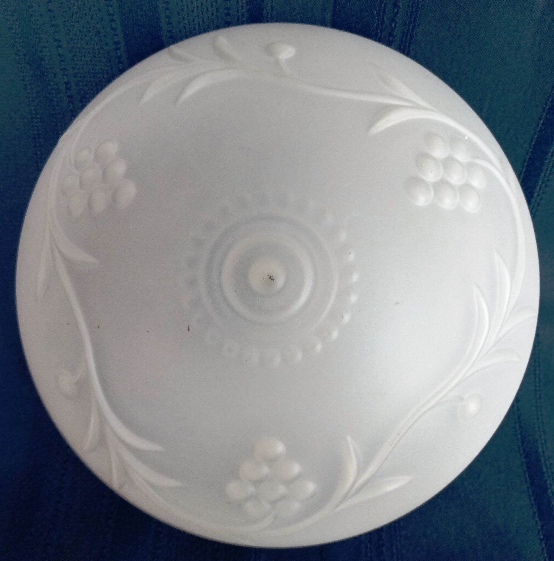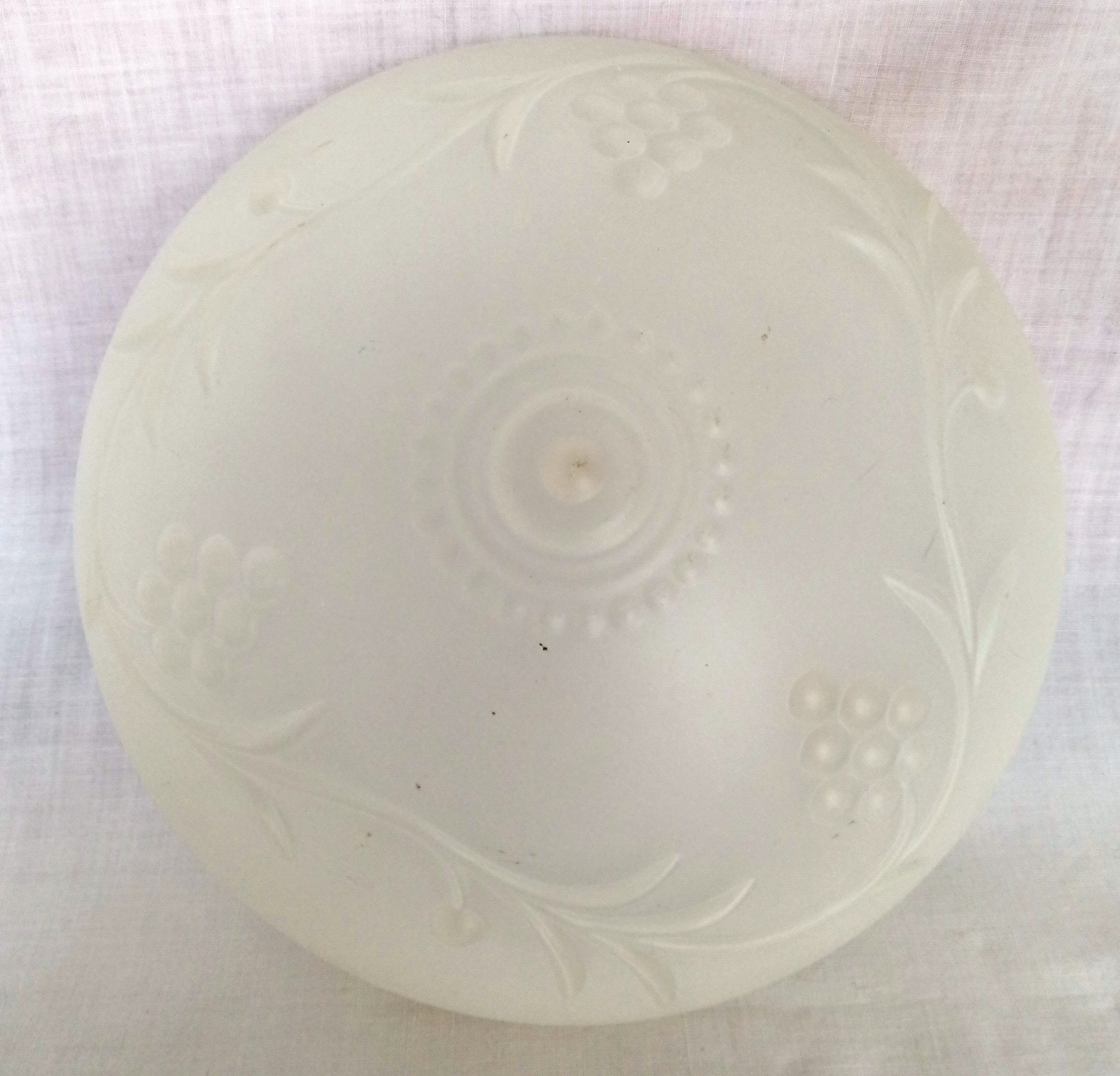 This listing is for a Mid Century, heavy, frosted glass replacement lamp shade /cover/globe for ceiling or wall light electric fixture. It has a bowl shape and features embossed grapes and vines design. Interior is glossy.