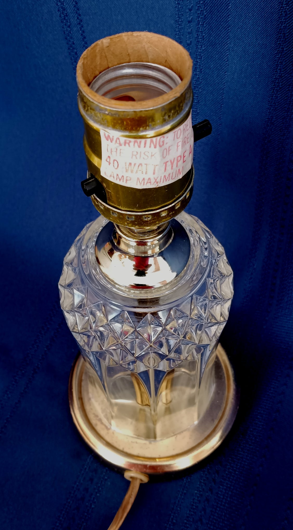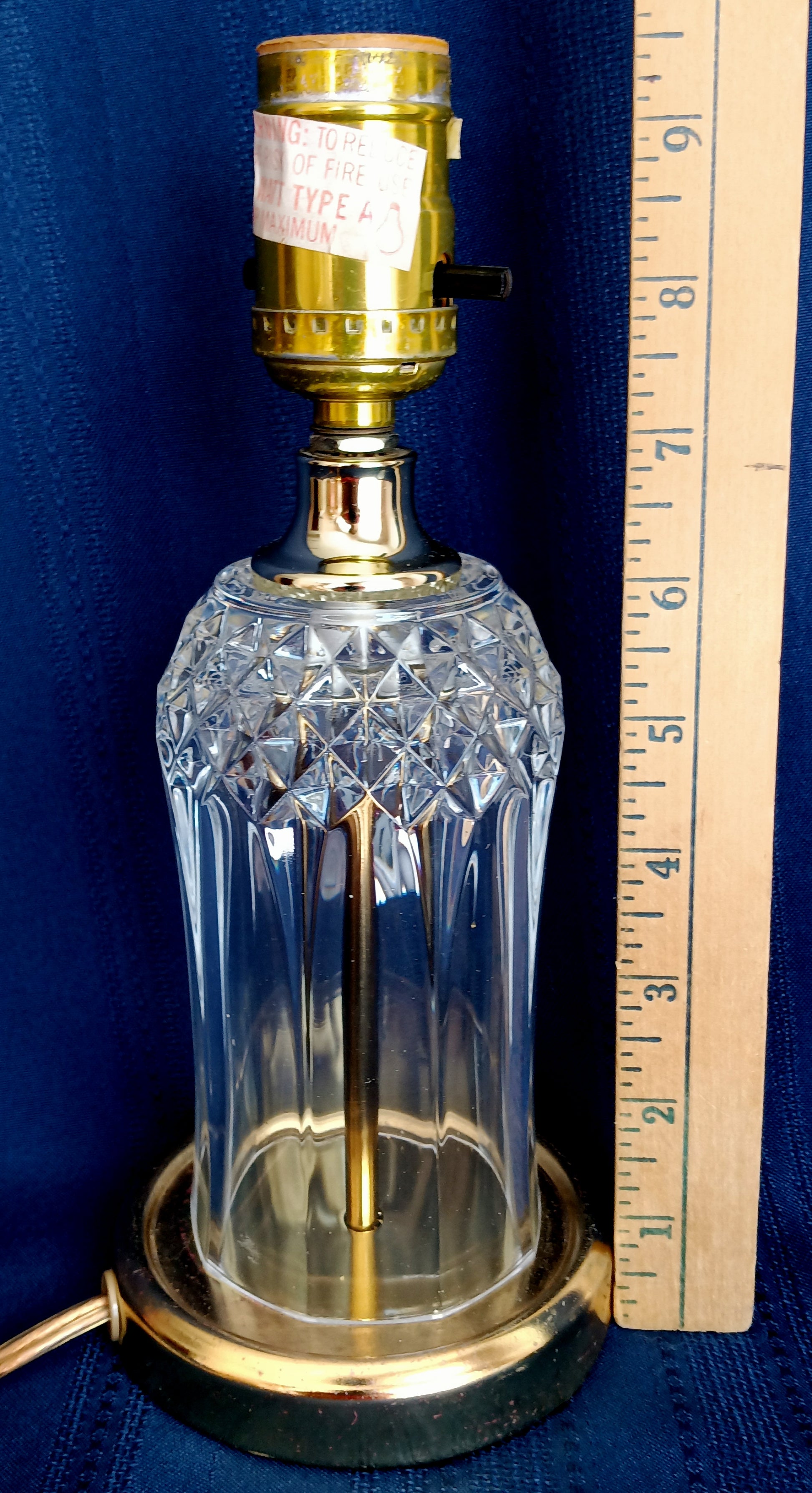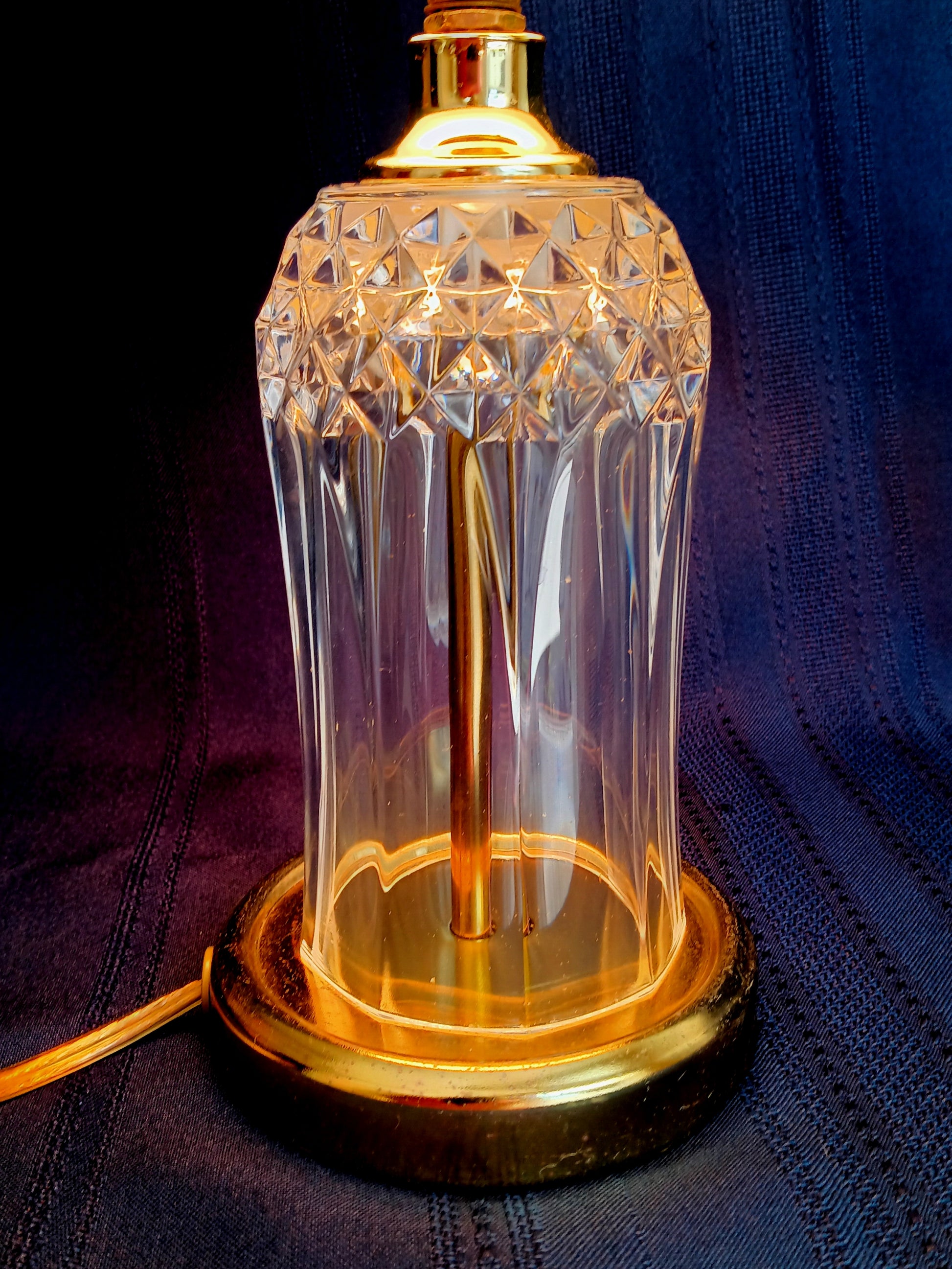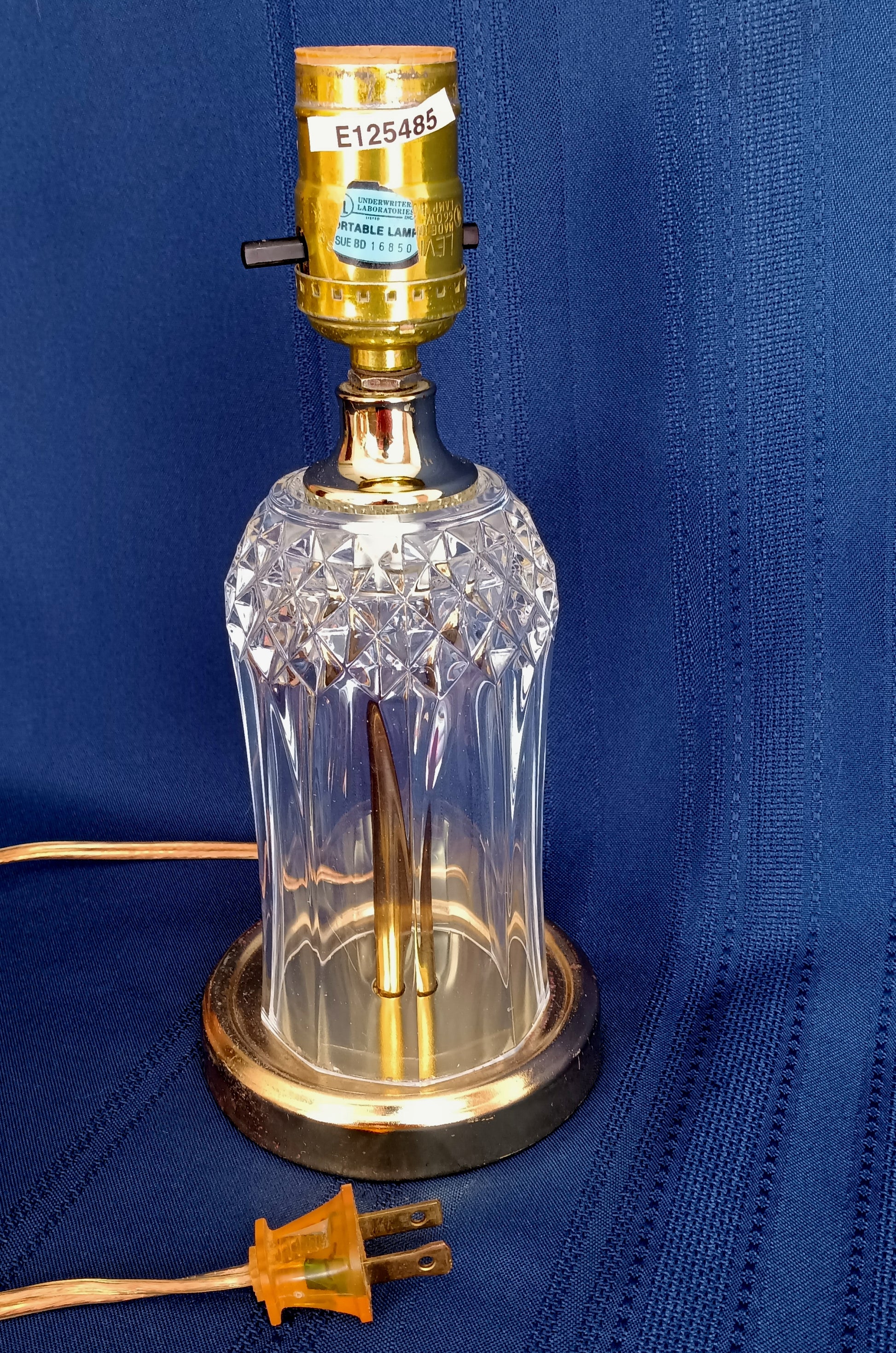 This listing is for a vintage crystal-clear pressed glass electric small lamp. It features brass finish metal accents on base and lamp neck. The crystal glass body is an airy vase shape with geometrical design (diamonds). Socket is made by Leviton with on/off push thru switch. Lamp takes one medium standard base bulb maximum 40 watt (not included). Attached is a blue sticker that reads: UL Inc. PORTABLE LAMP ISSUE BD 16850 E 125485. It was assembled by HEYCO Industries. Good working condition. Shade and bulb are not included.