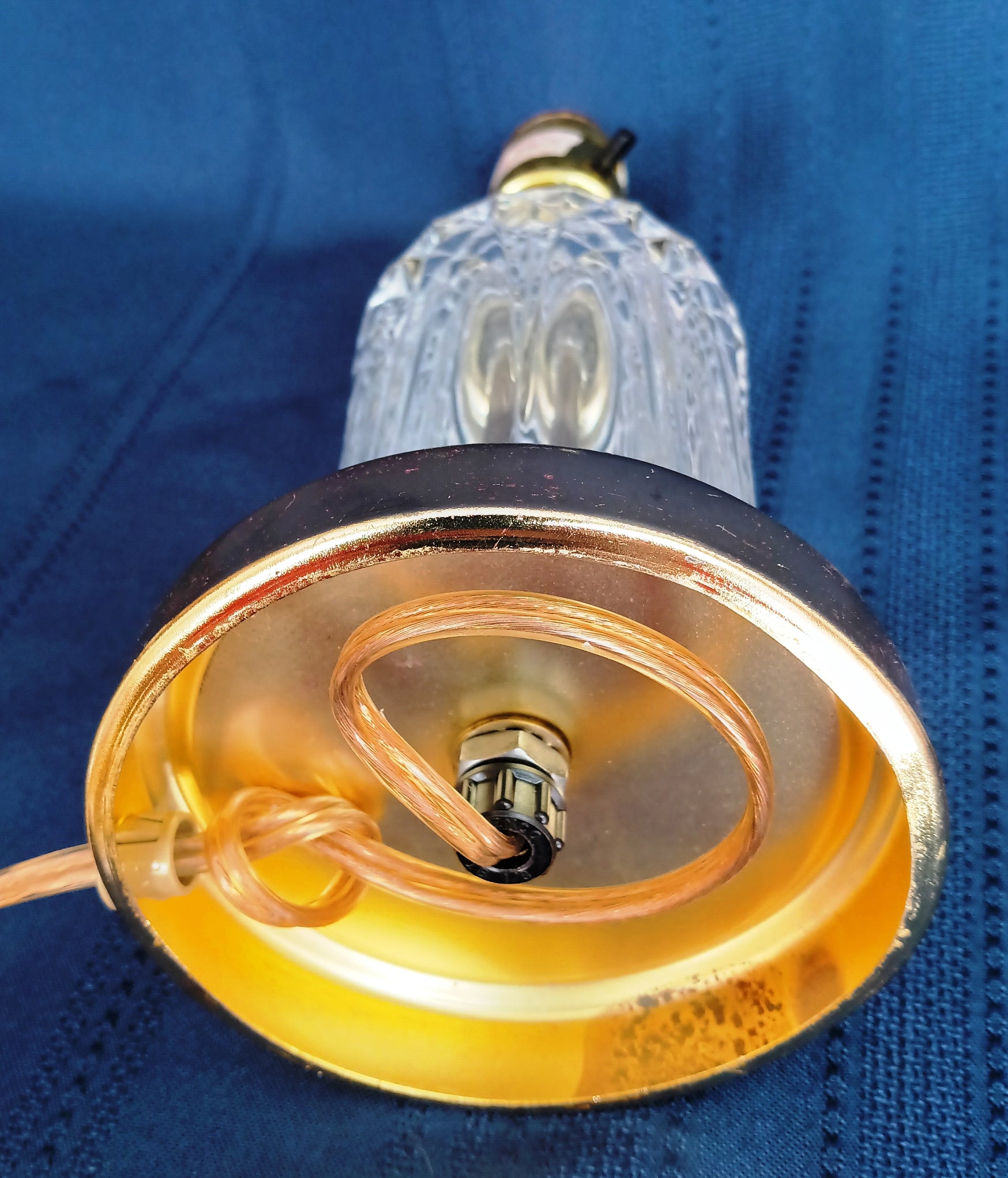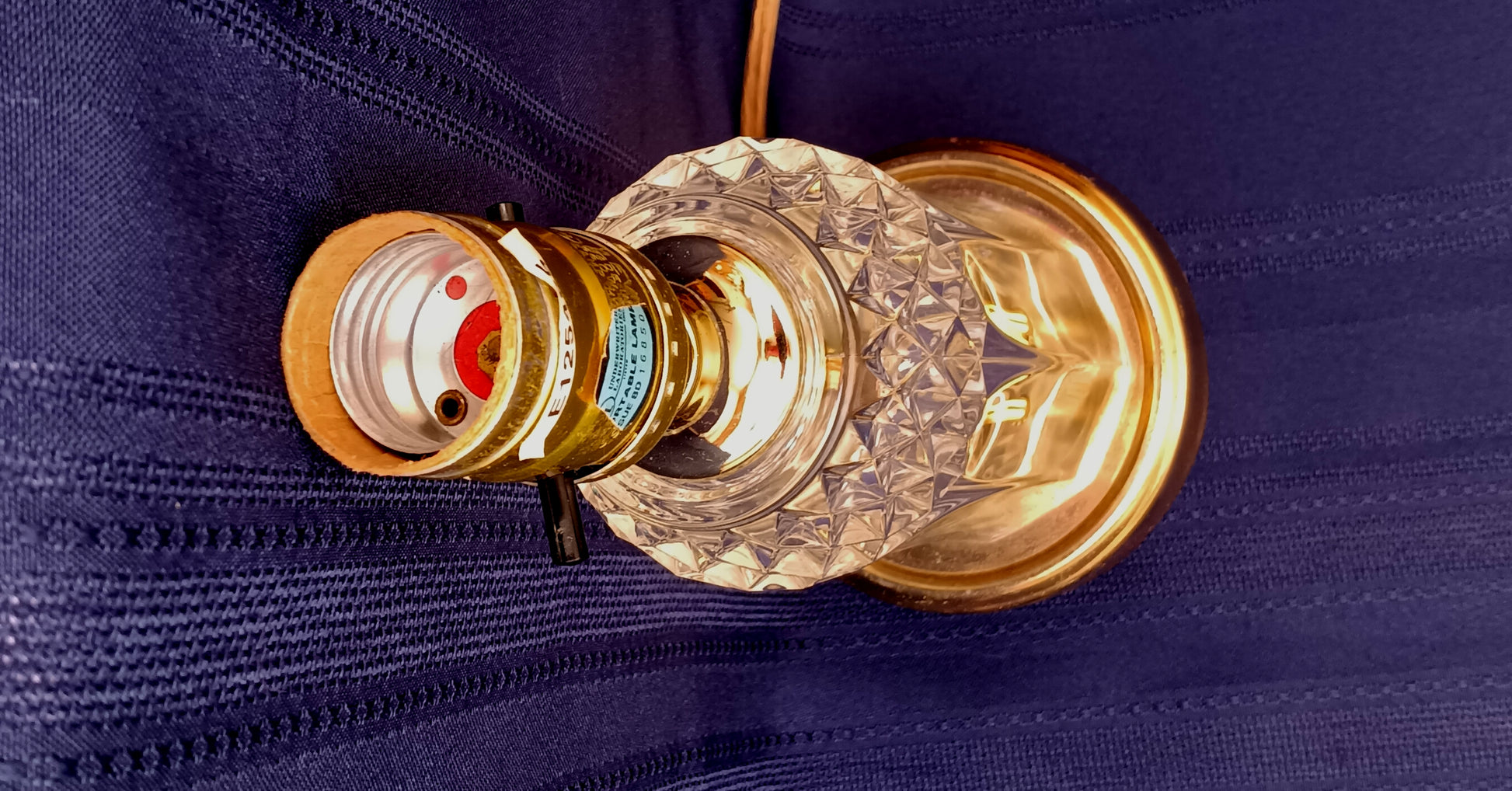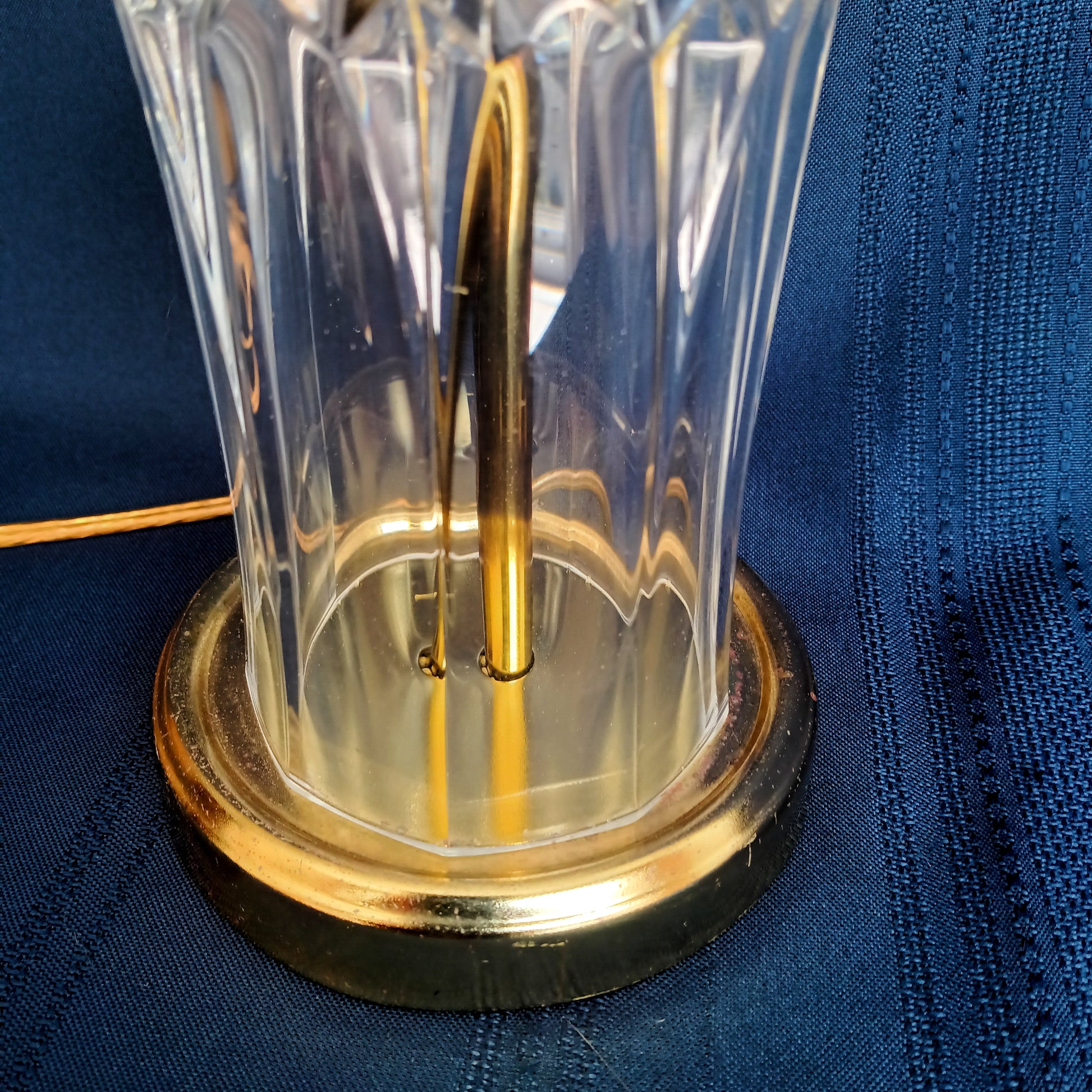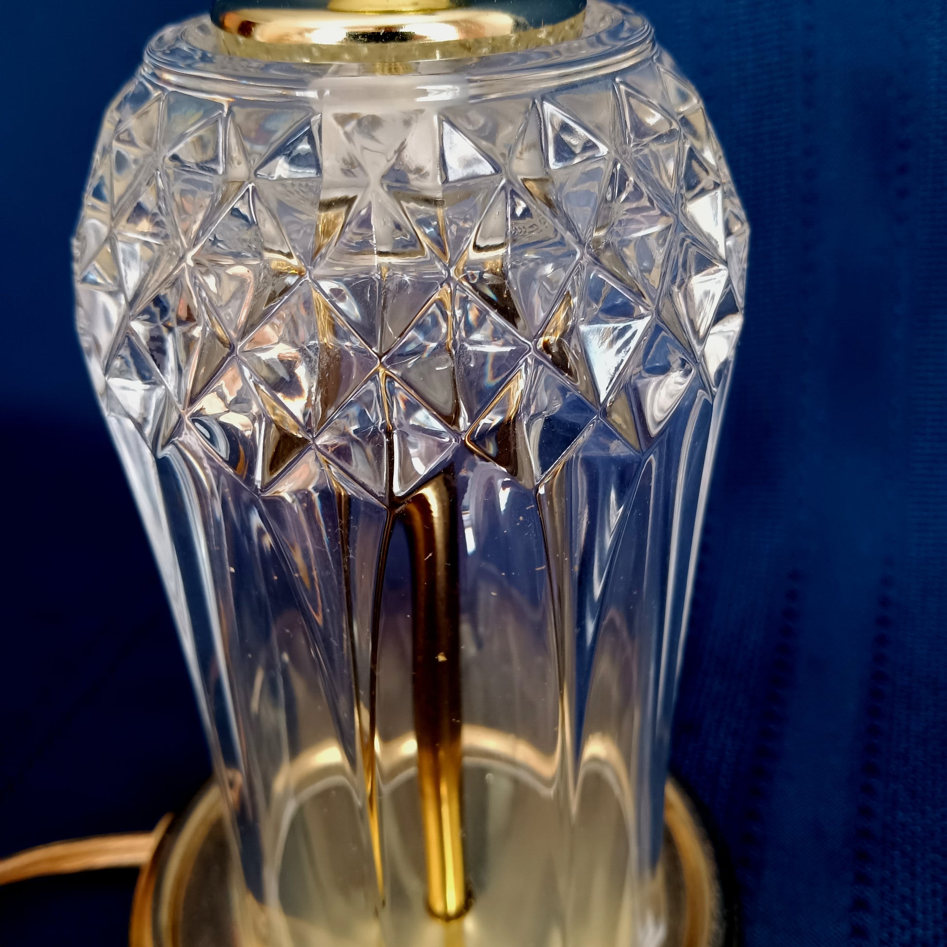 This listing is for a vintage crystal-clear pressed glass electric small lamp. It features brass finish metal accents on base and lamp neck. The crystal glass body is an airy vase shape with geometrical design (diamonds). Socket is made by Leviton with on/off push thru switch. Lamp takes one medium standard base bulb maximum 40 watt (not included). Attached is a blue sticker that reads: UL Inc. PORTABLE LAMP ISSUE BD 16850 E 125485. It was assembled by HEYCO Industries. Good working condition. Shade and bulb are not included.