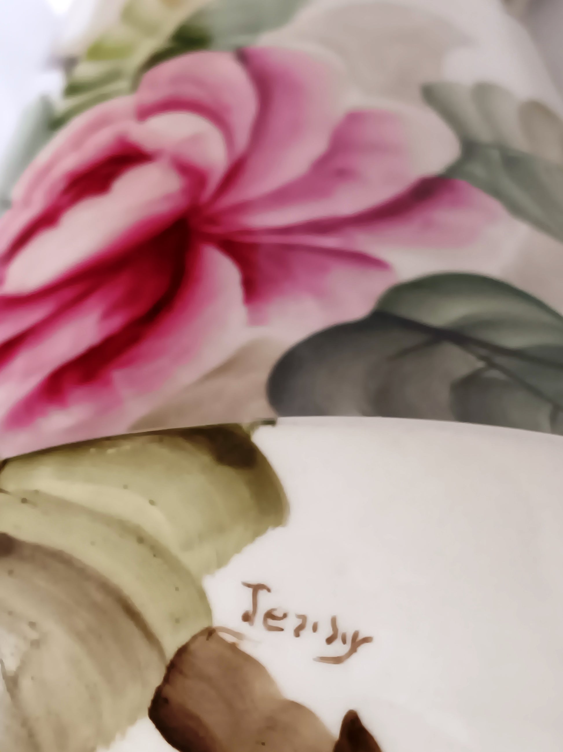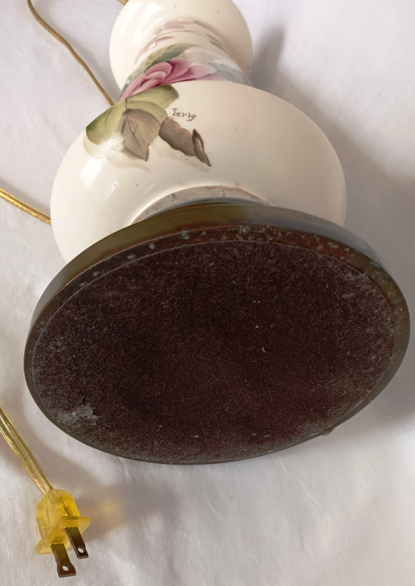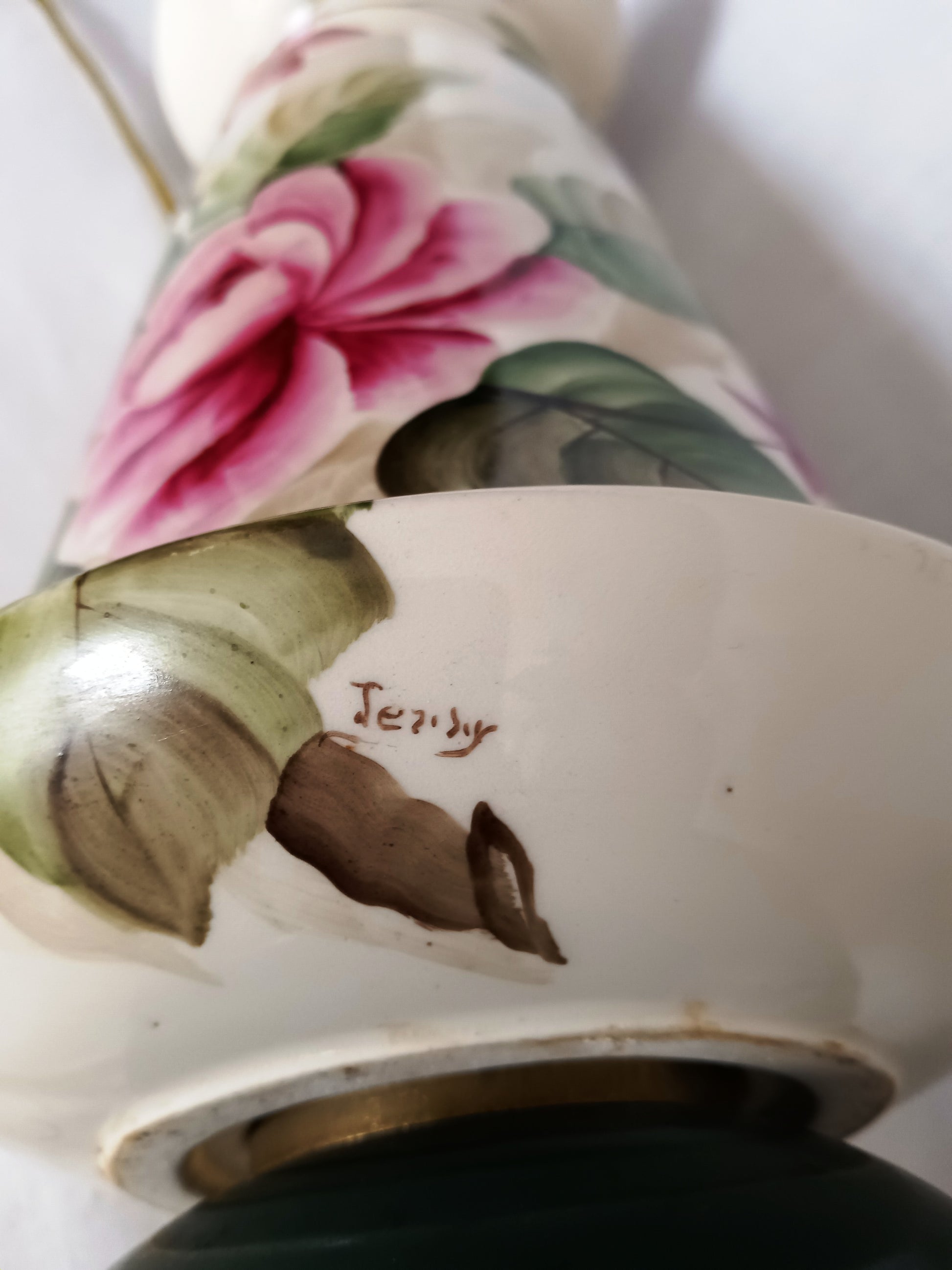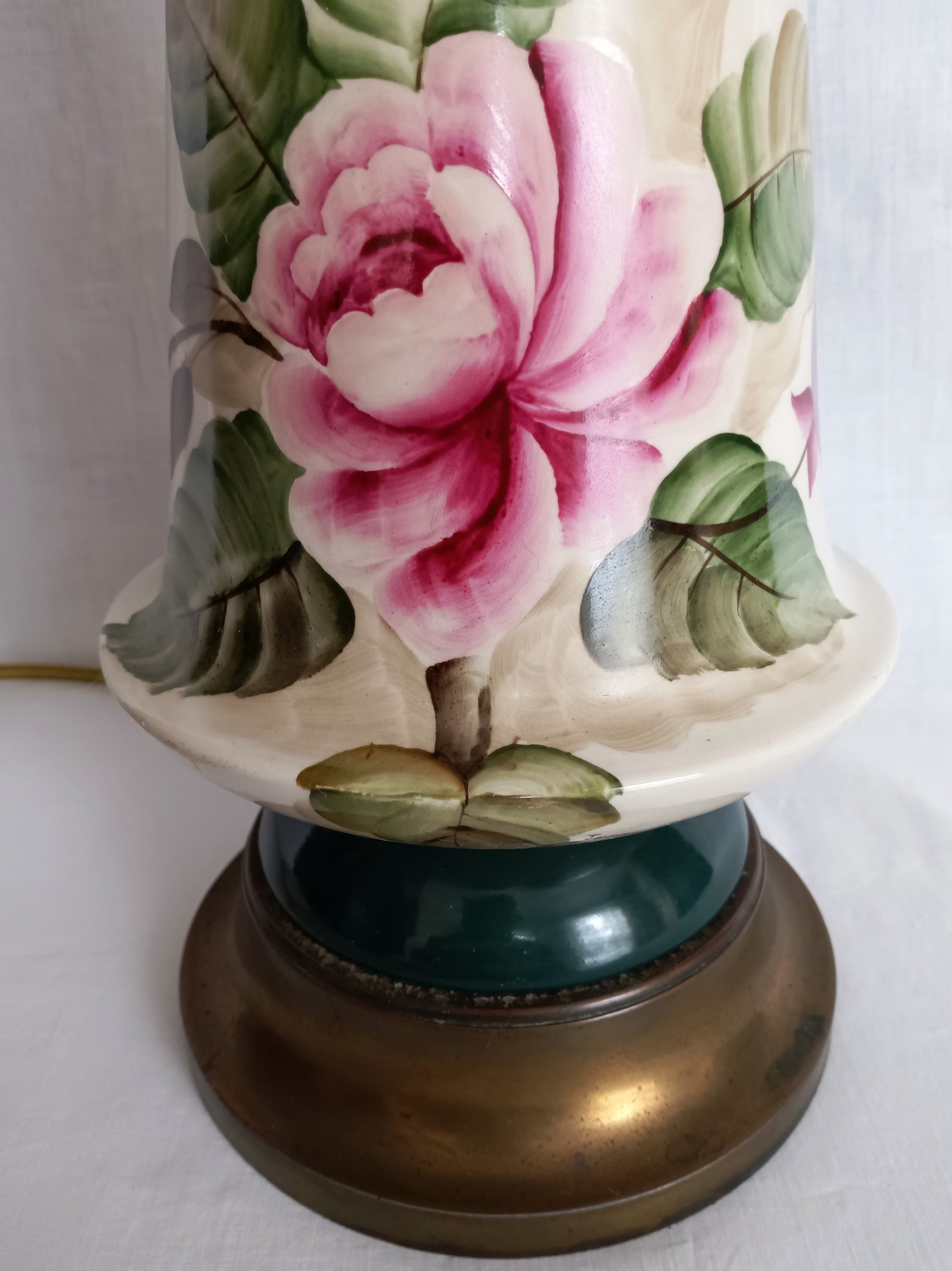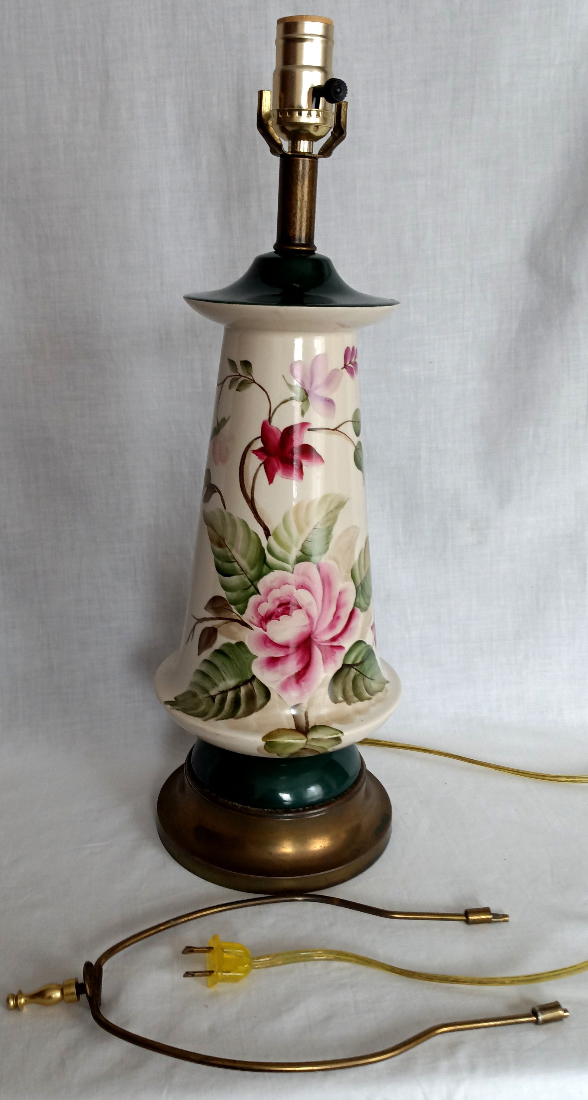 This listing is for a tall glaze ceramic table lamp. Lamp features a flared, light cream ceramic base with hand painted soft pastel pink roses and green leaves. It has a round brass toned metal base and a dark green accent piece above the metal base and one on top. Felt on the bottom. Lamp operates with on / off switch and takes E26 standard base bulb 60 watt 3-way, providing three different levels of brightness (low, medium, high). Good working condition. Brass plated metal harp and finial come with the lamp. Lampshade is not included. On the bottom is a handwritten signature that reads: Jezidy.