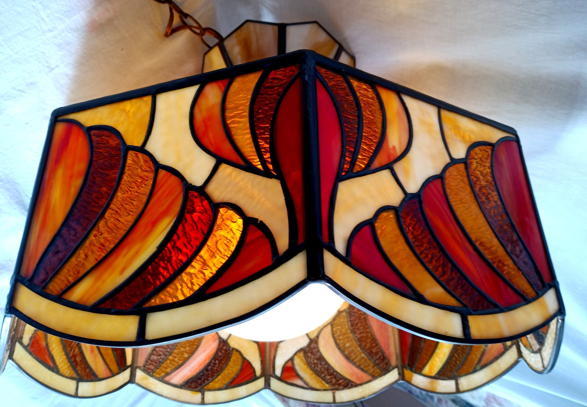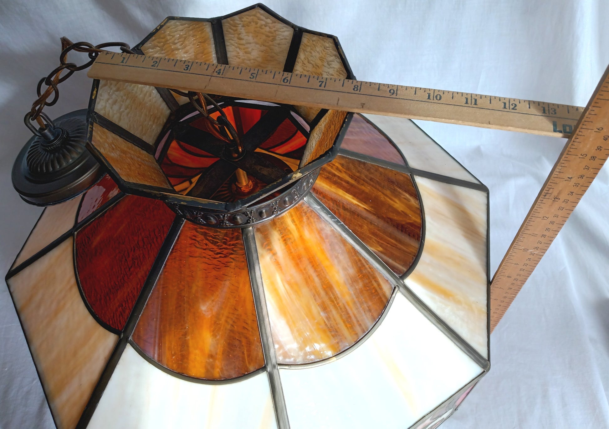 This listing is for a vintage handcrafted Tiffany style, indoor, large size, dome shape, swag pendant/ hanging lamp/ electric light fixture with scalloped top and bottom. Dome type, octagonal shape, this pendant feature intrigue design made with ivory, ample tones of brown and pink stained glass slag panels reinforced in brass copper frame. Stained glass slag panels are textured in the inner side and with smooth texture on outer side of the lampshade. Brass embossed embellishment ribbon is under the crown top. Electric fixture comes with white glass globe (round shape), 12” cord and chain, screw collar loop, crossbar, and brass canopy. This lamp uses one bulb base: E26/E27 75-Watt maximum (is not included). Good working condition. Pendant has a great quality, very heavy and sturdy construction.