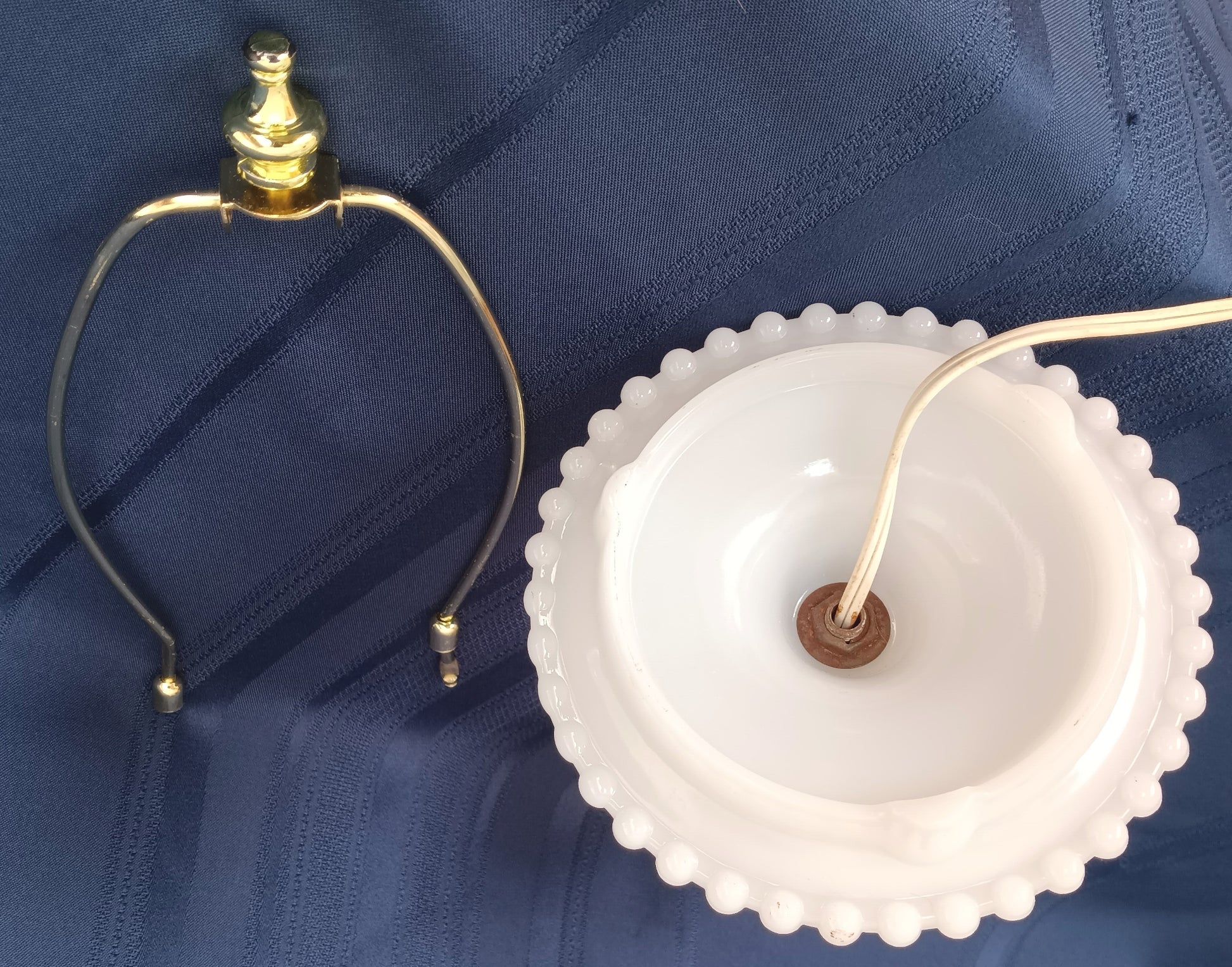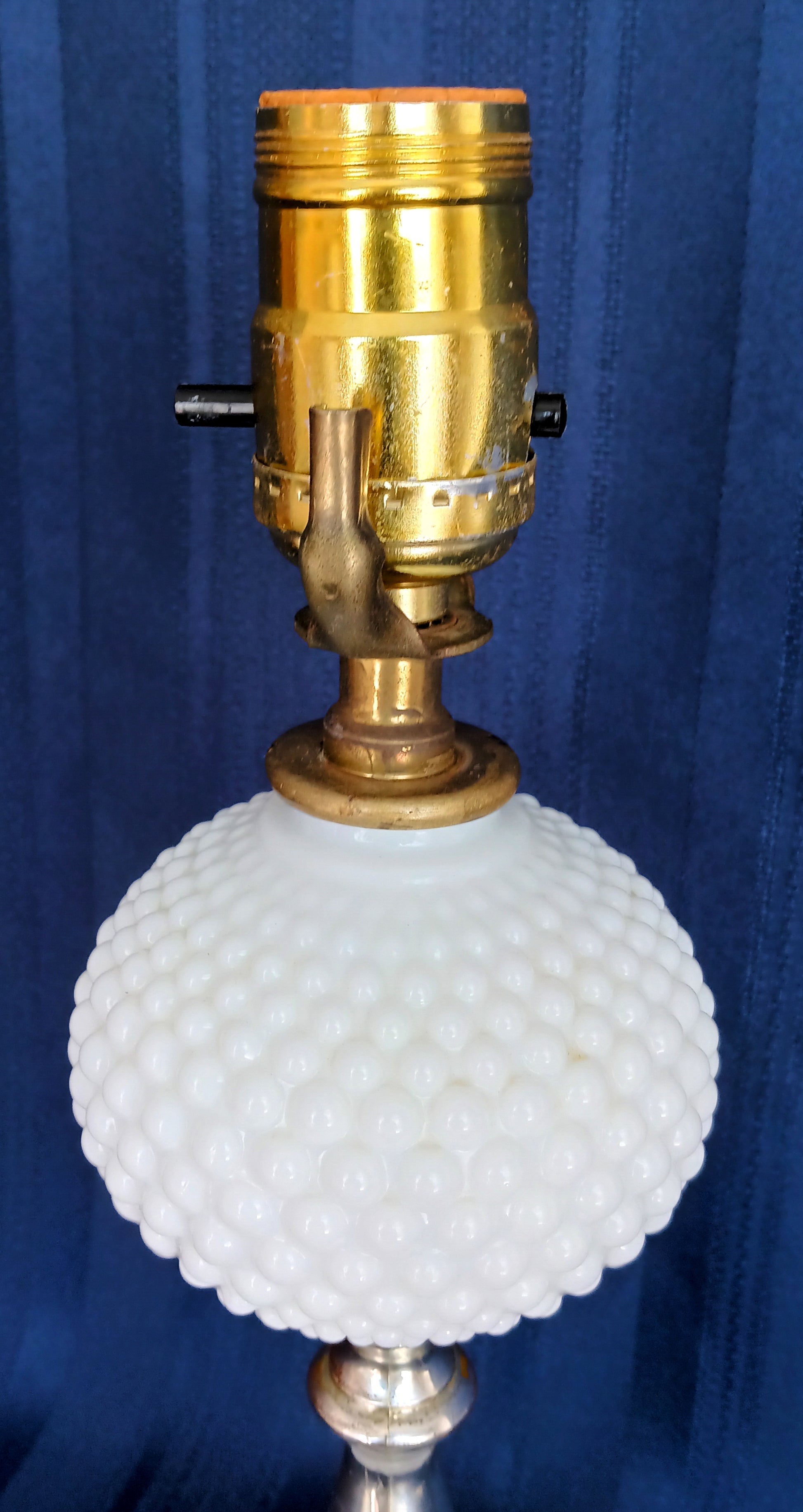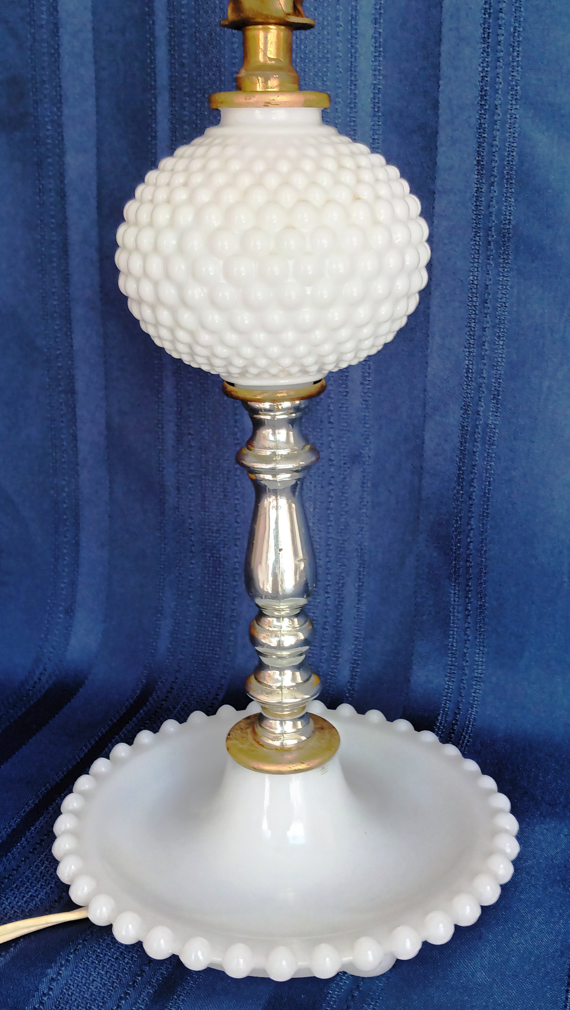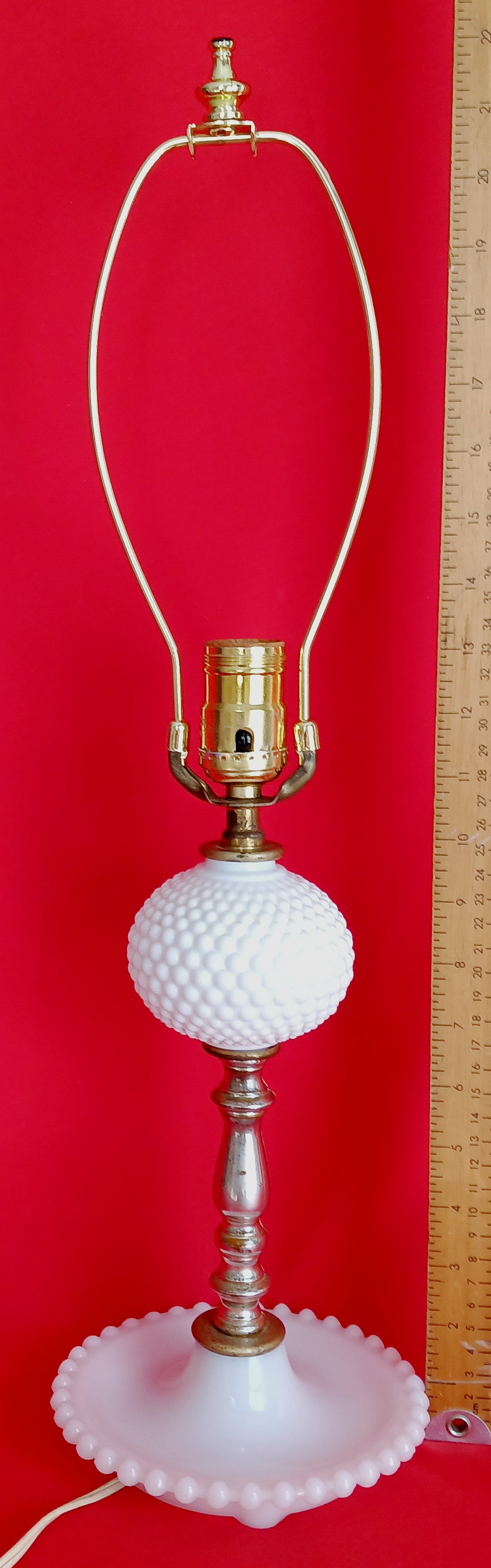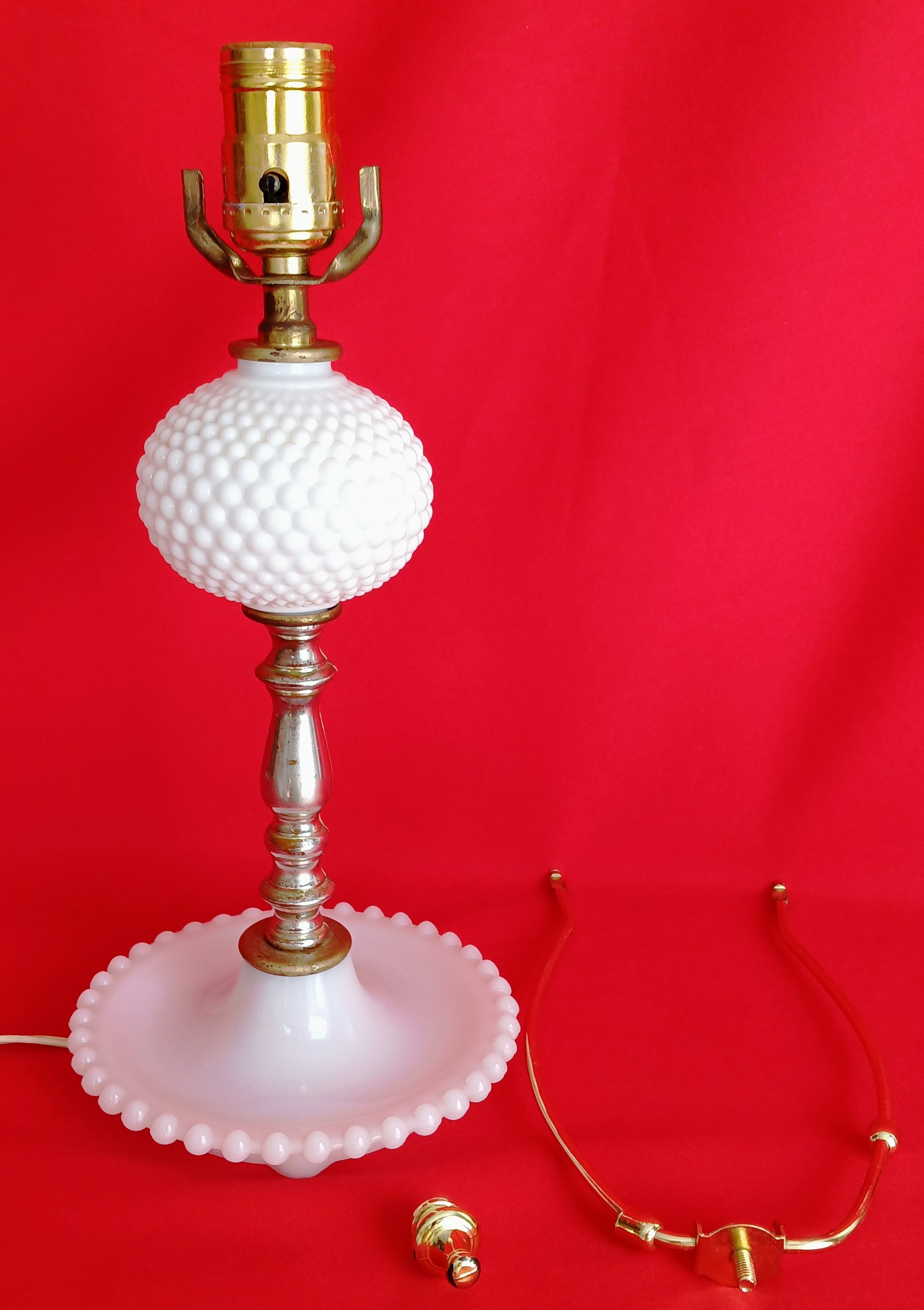 This listing is for a mid-century lamp. It features hobnail milk glass design with chrome plated finish inner hardware. Beaded tray is footed. Lamp comes with brass plated metal harp and finial. Lamp holder is made by Leviton with press on and off switch and 660W - 250V UL stamped on it and takes a standard bulb max 60 Watt. All parts are in good working condition. Bulb and shade are not included.