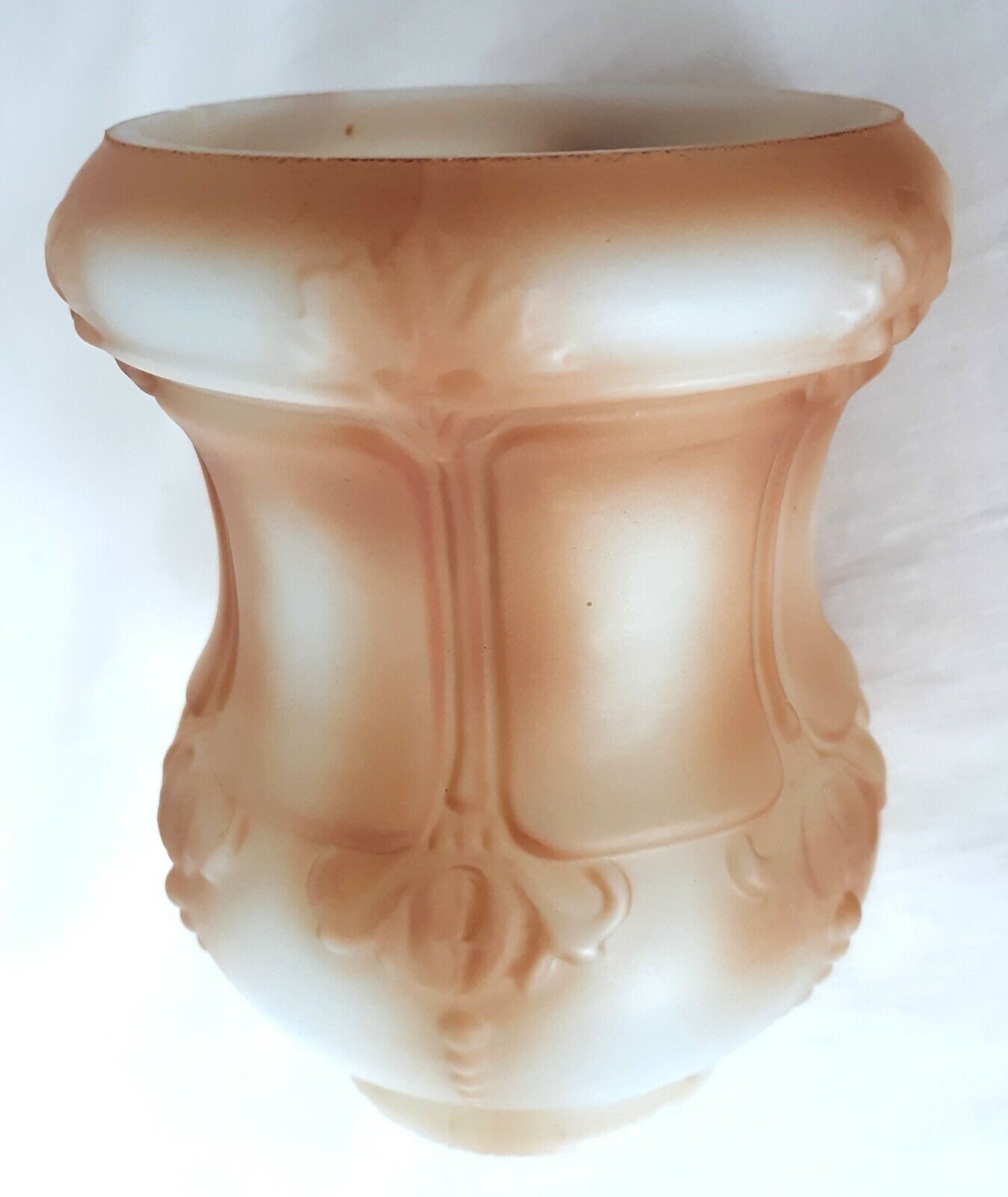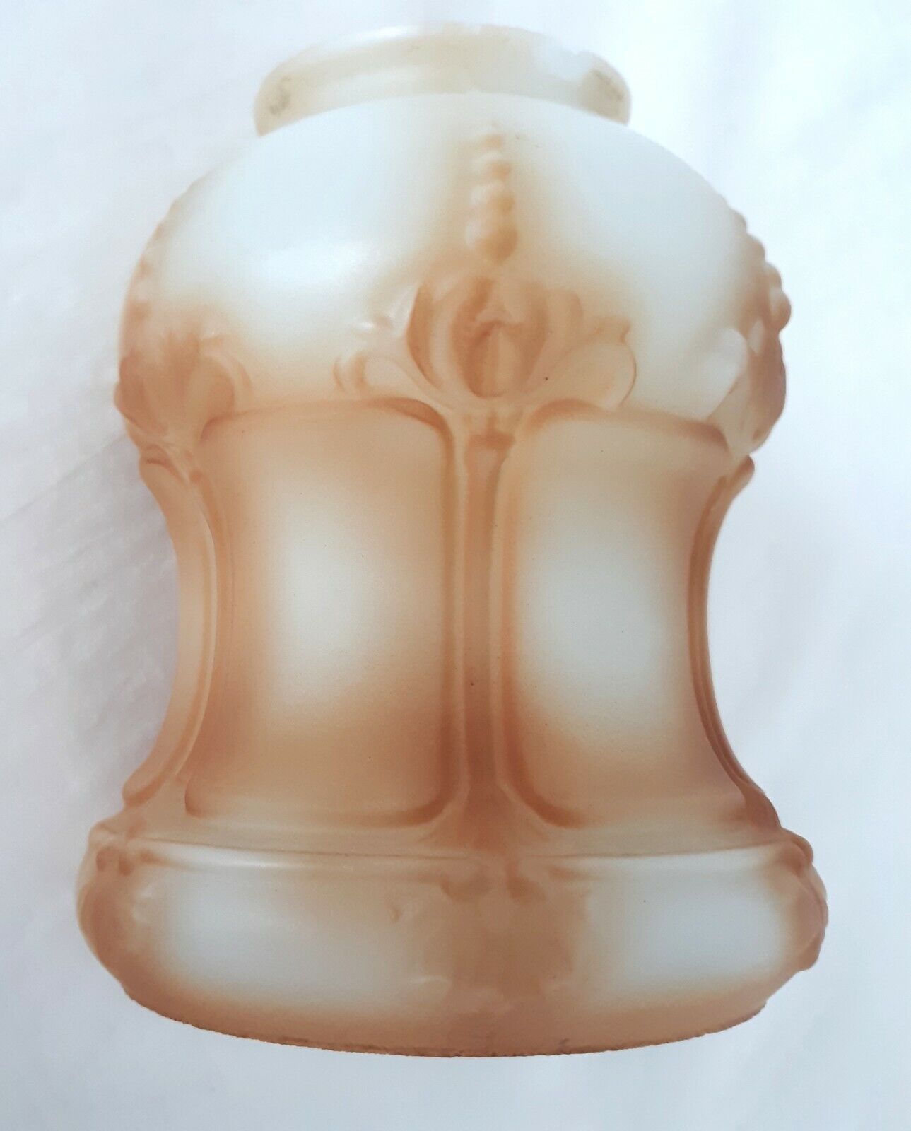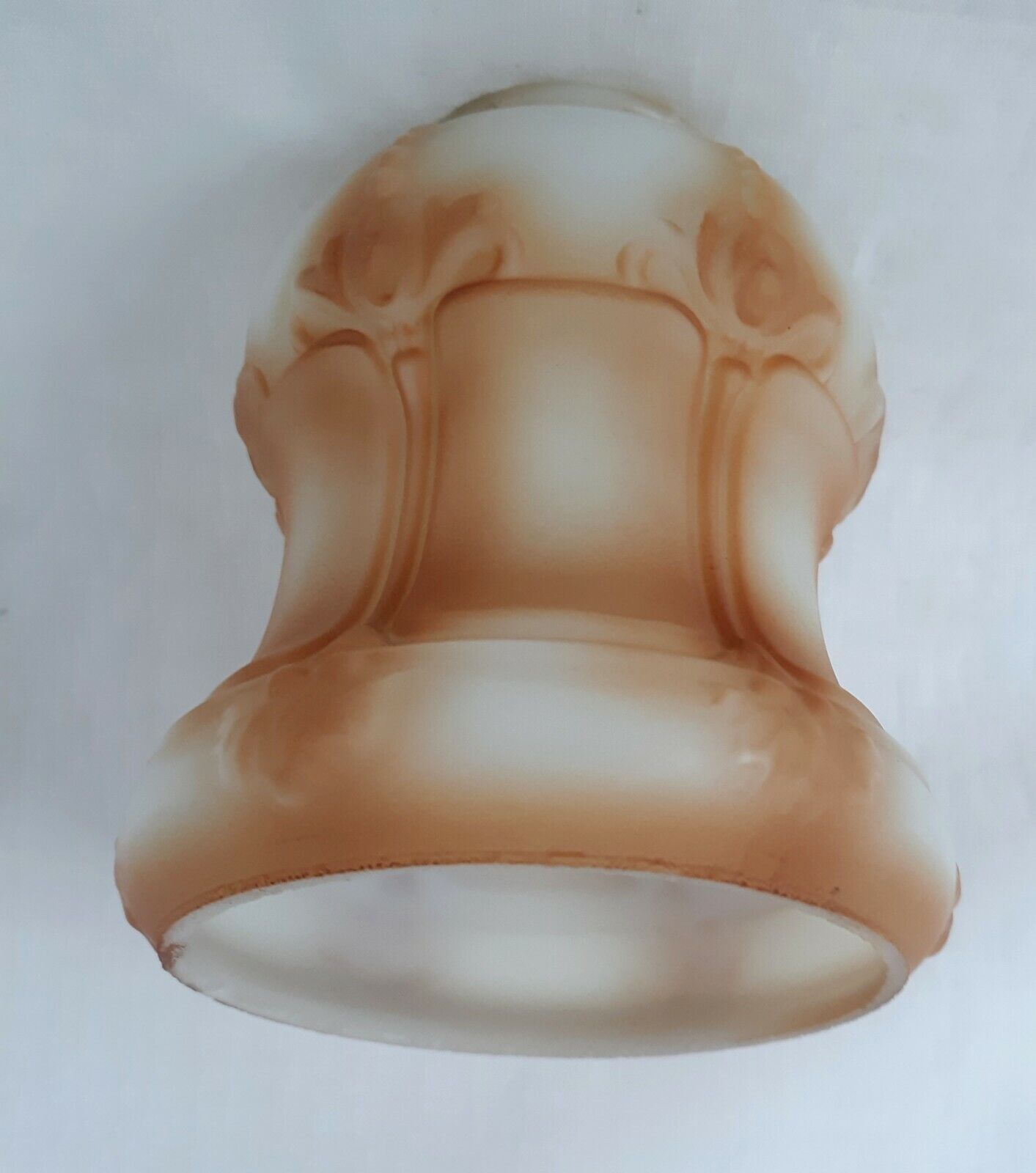 This listing is for an antique Art Nouveau white opaque glass bell shaped lamp shade with embossed design and hand painted brown accents. Lampshade was removed from an old Victorian house outskirt of Philadelphia.