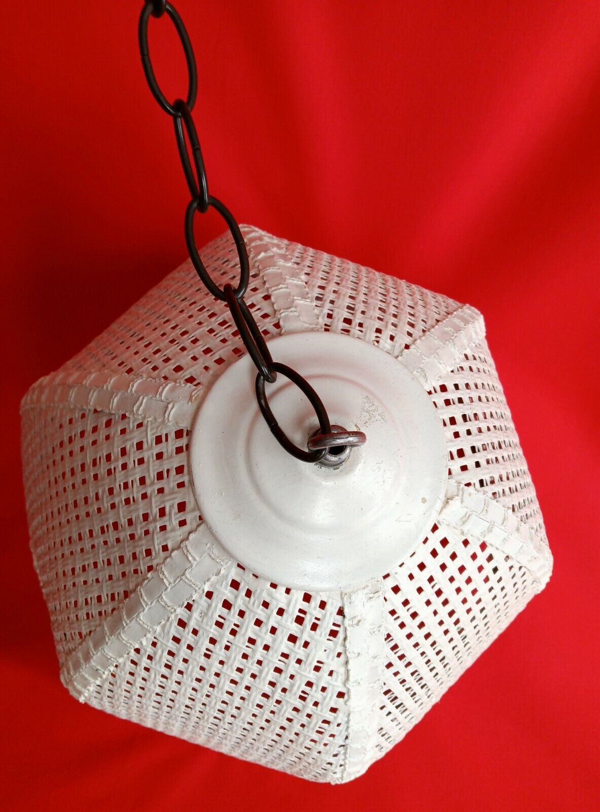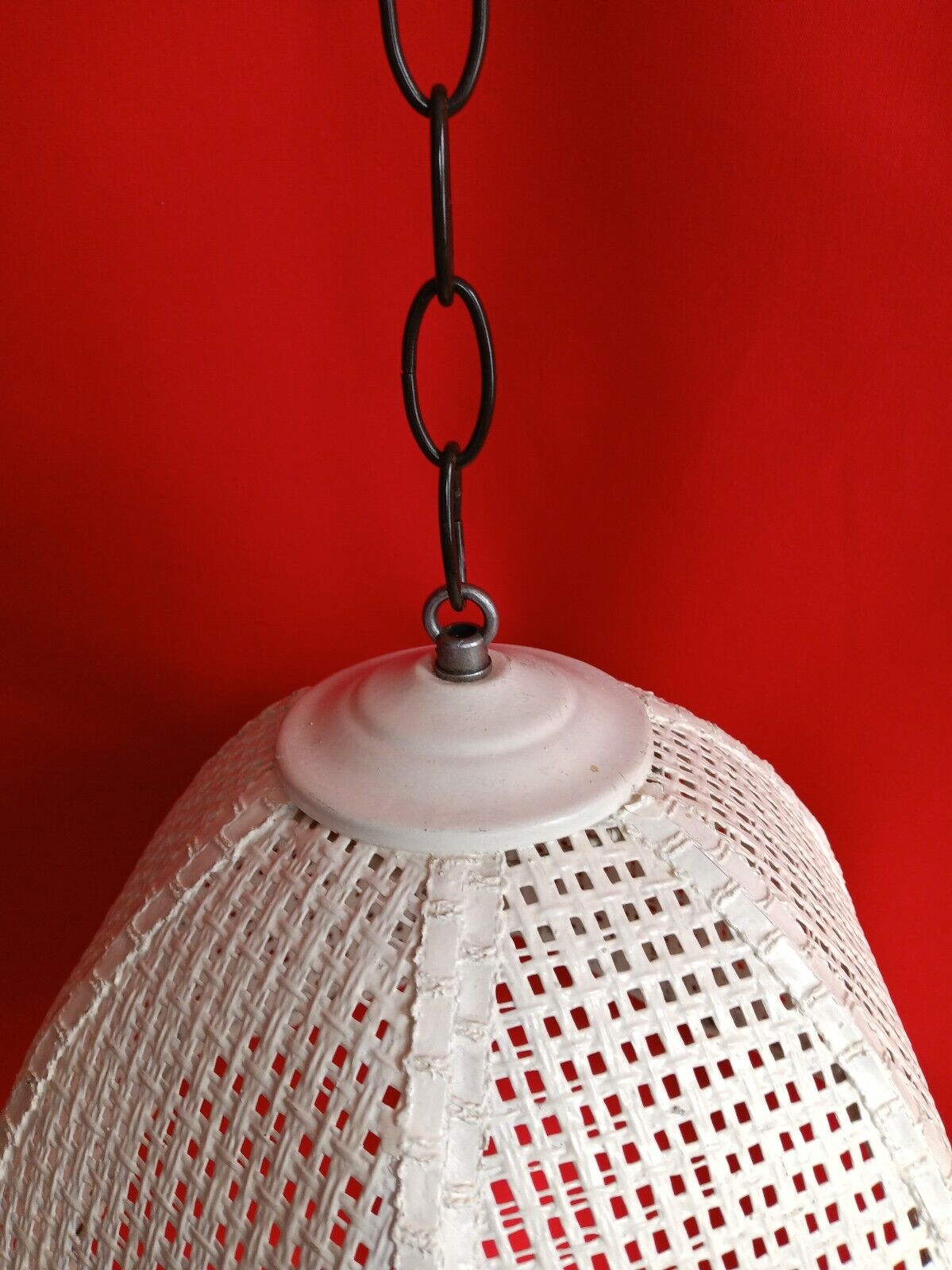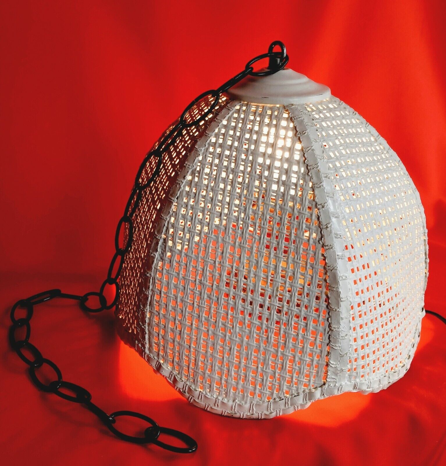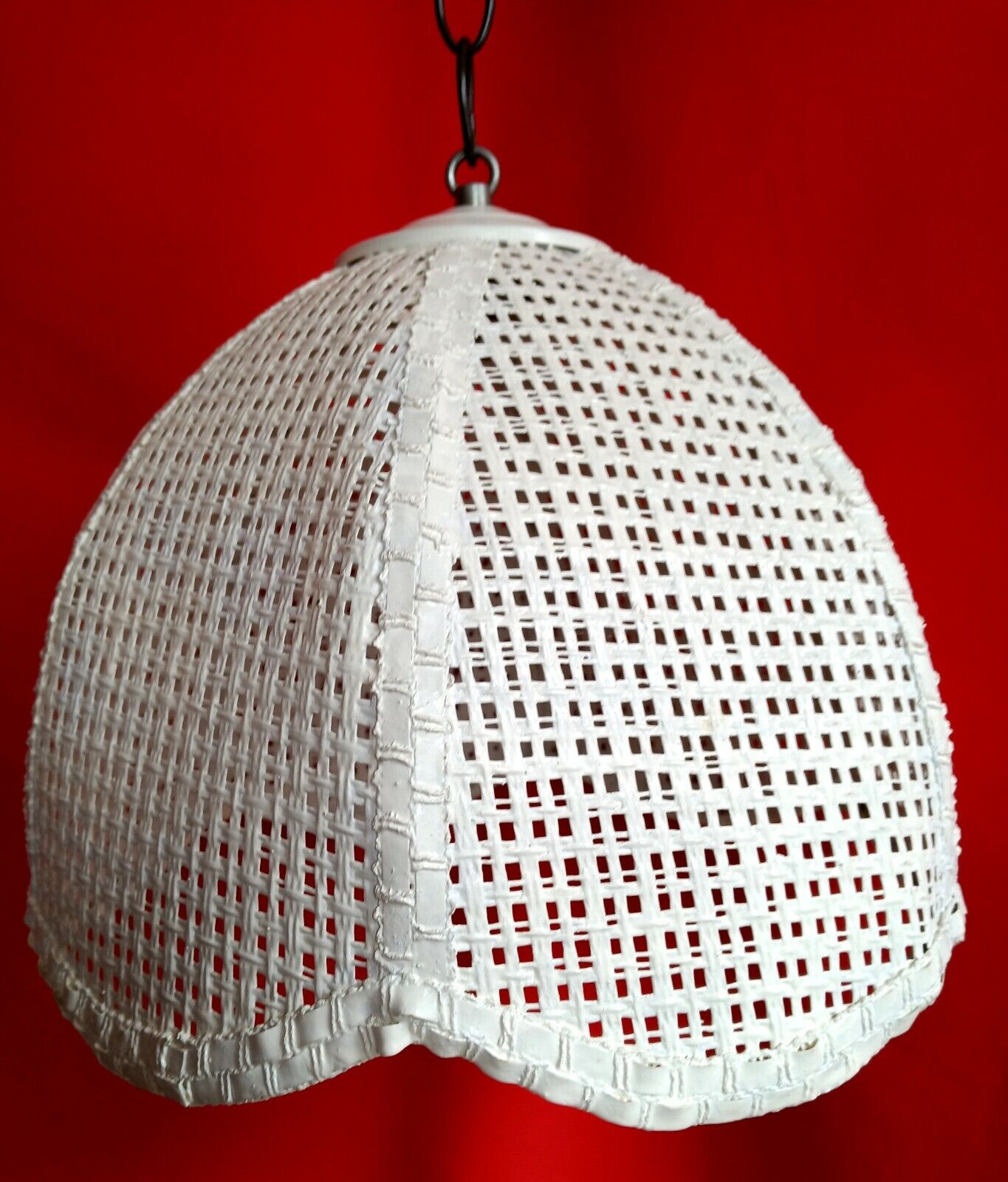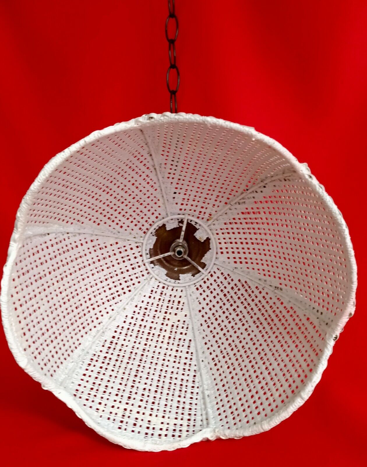 For sale is a vintage woven wicker/rattan lampshade painted off white with pretty pattern and scallop edges. Shade comes with 26” long black metal chain. Because is just a lampshade, it doesn’t come with electrical wiring and plug, but it has a metal female loop attached to the top. In this way you can create your own hanging lamp with the right accessories.